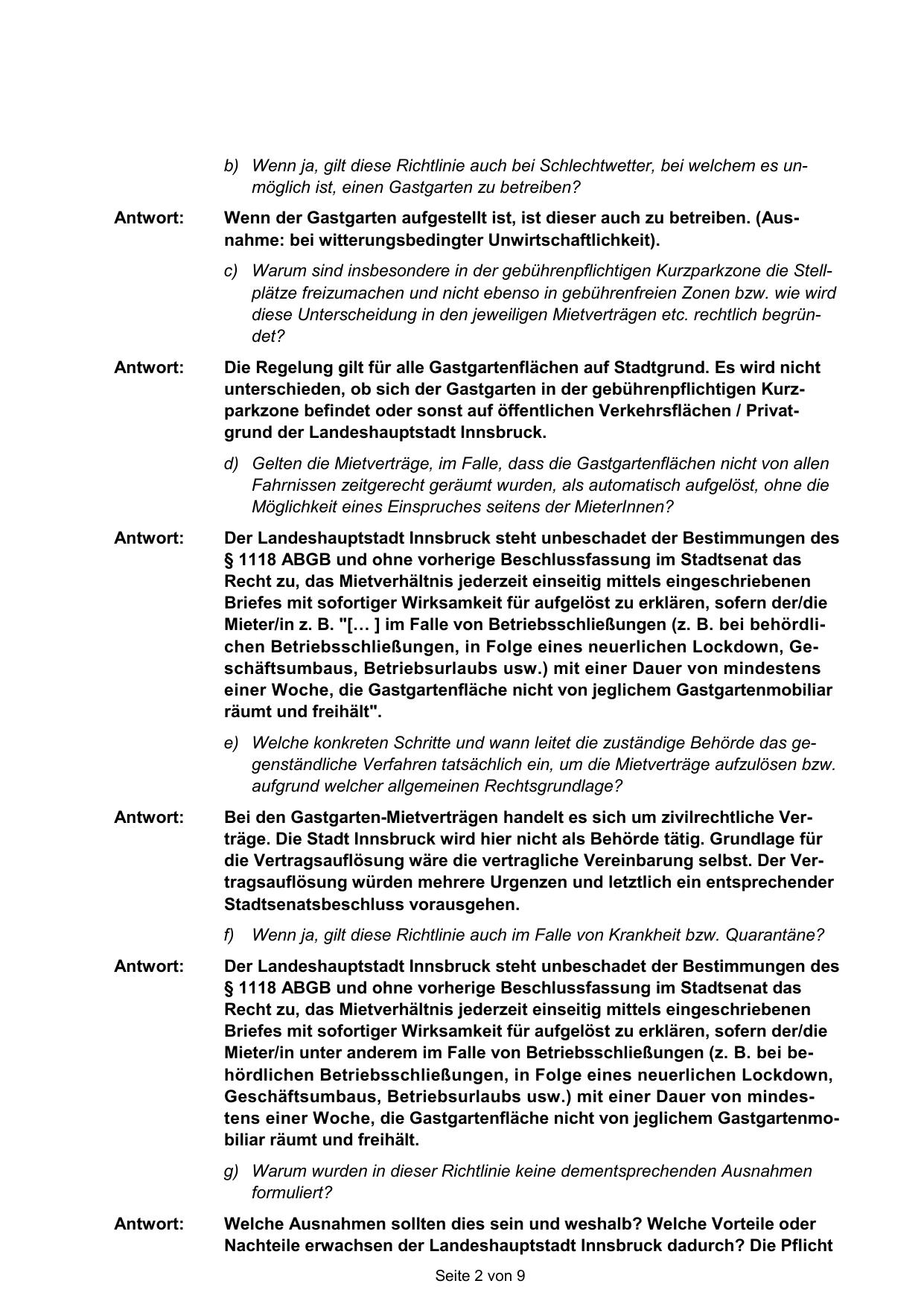 Bei den Gastgarten-Mietverträgen handelt es sich um zivilrechtliche Verträge. Die Stadt Innsbruck wird hier nicht als Behörde tätig. Grundlage für