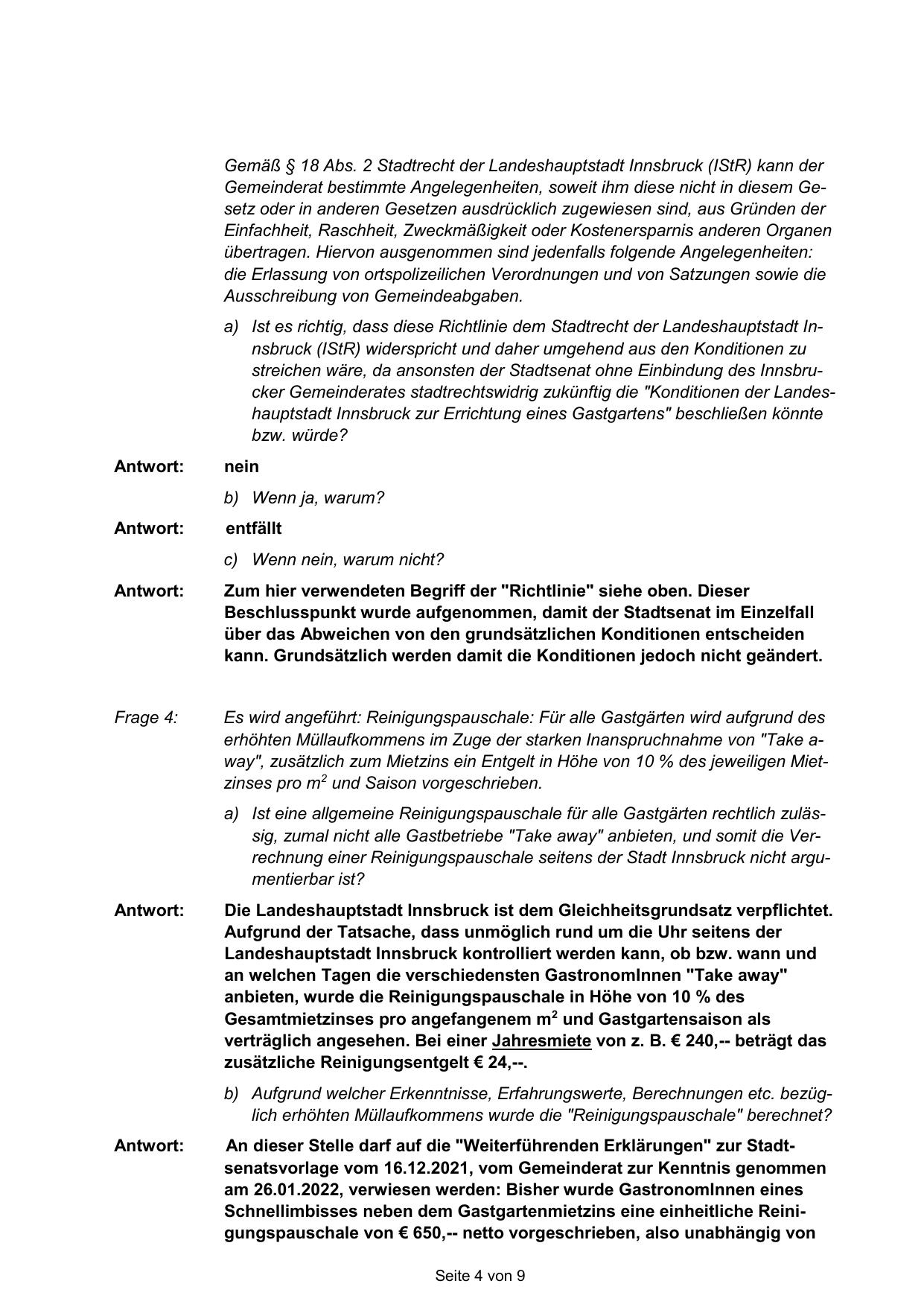 streichen wäre, da ansonsten der Stadtsenat ohne Einbindung des Innsbrucker Gemeinderates stadtrechtswidrig zukünftig die "Konditionen der Landeshauptstadt Innsbruck zur Errichtung eines Gastgartens" beschließen könnte
