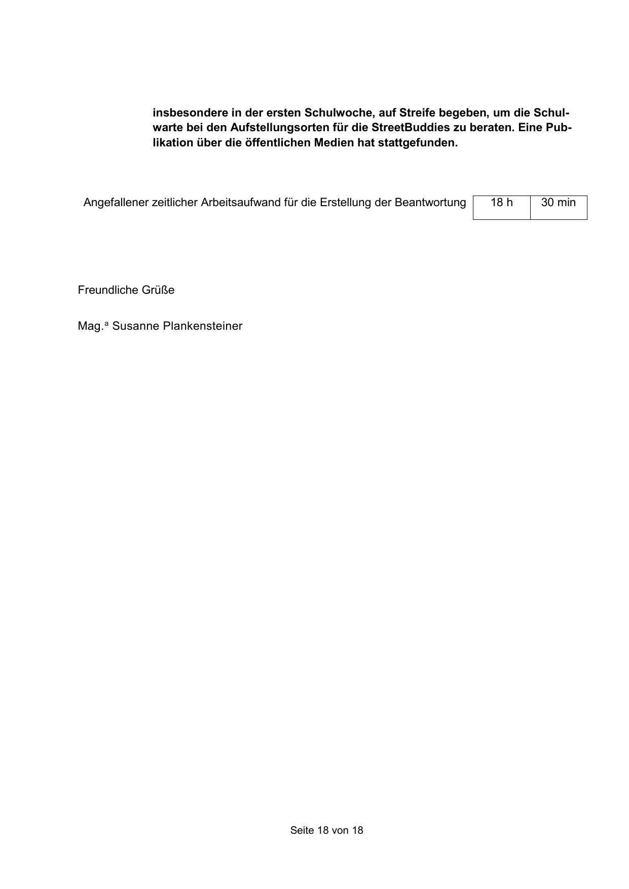 insbesondere in der ersten Schulwoche, auf Streife begeben, um die Schulwarte bei den Aufstellungsorten für die StreetBuddies zu beraten. Eine Publikation über die öffentlichen Medien hat stattgefunden.