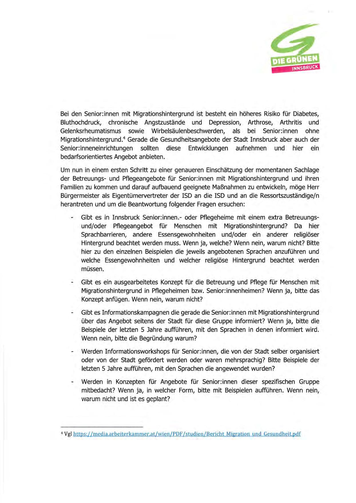 Gibt es in Innsbruck Senior:innen.- oder Pflegeheime mit einem extra Betreuungsund/oder Pflegeangebot für Menschen mit Migrationshintergrund? Da hier