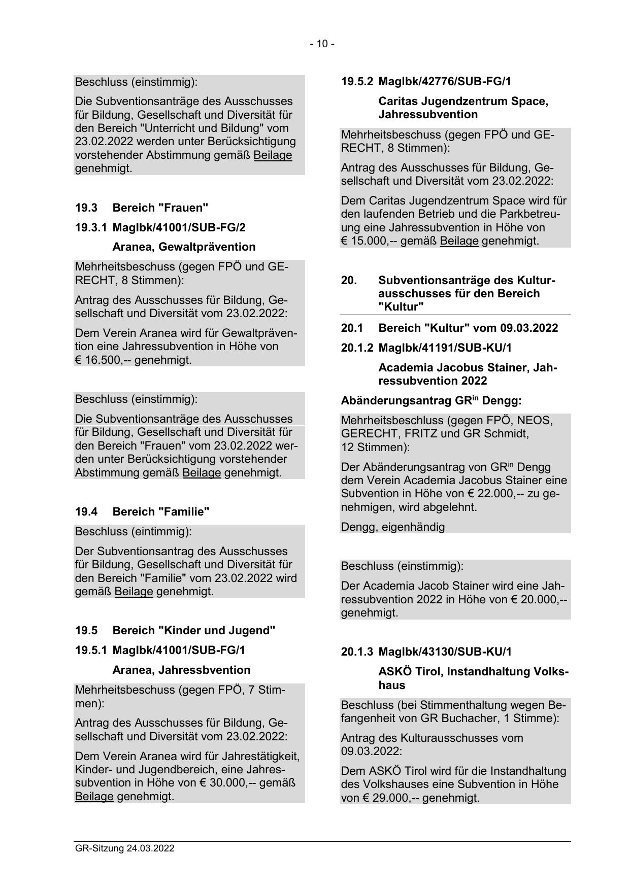 Mehrheitsbeschuss (gegen FPÖ und GERECHT, 8 Stimmen):