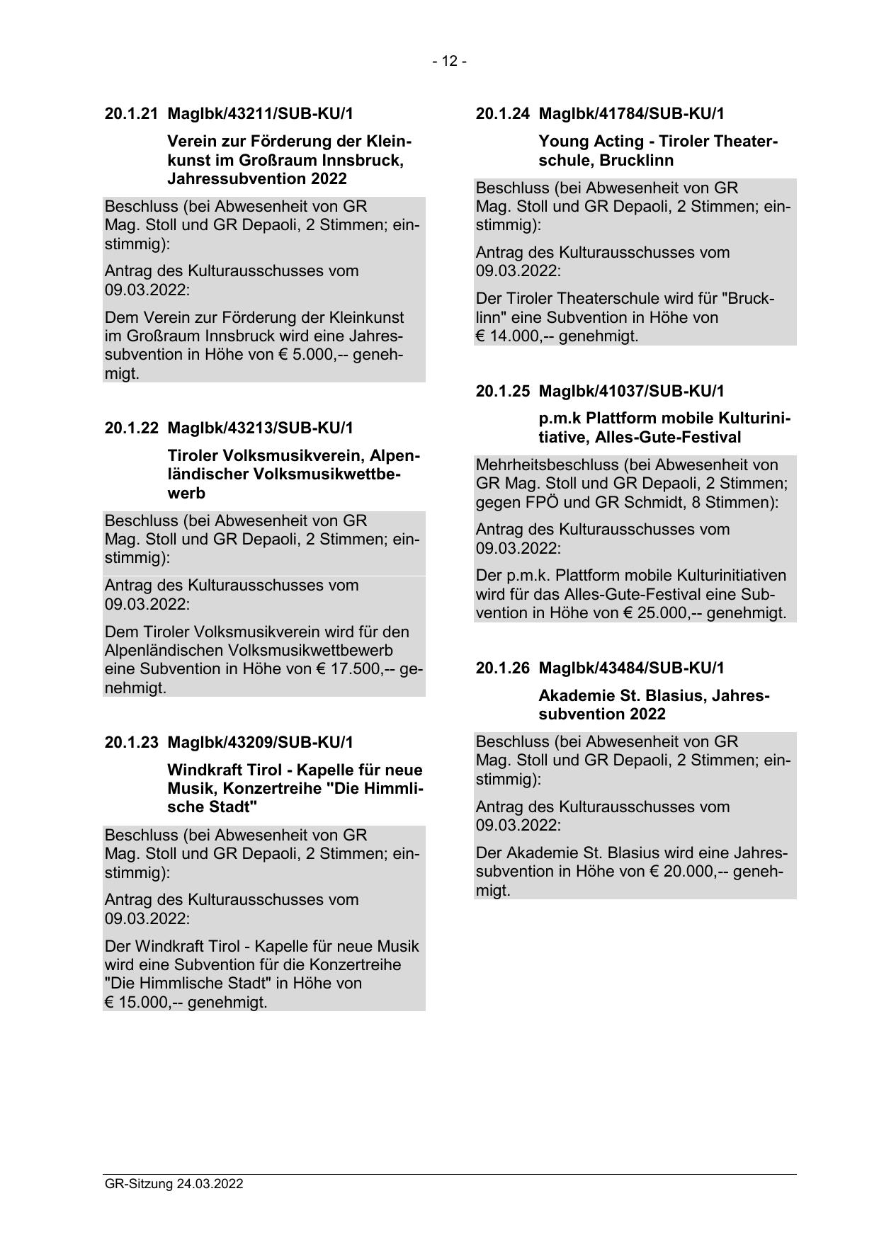 Der Akademie St. Blasius wird eine Jahressubvention in Höhe von € 20.000,-- genehmigt.