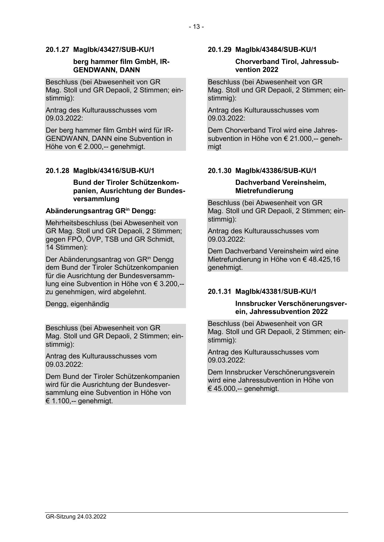 GR Mag. Stoll und GR Depaoli, 2 Stimmen;