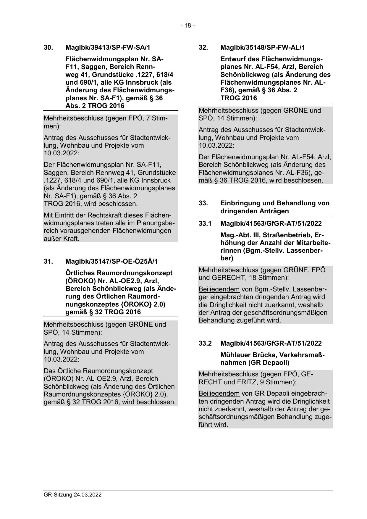 Mehrheitsbeschluss (gegen FPÖ, GERECHT und FRITZ, 9 Stimmen):