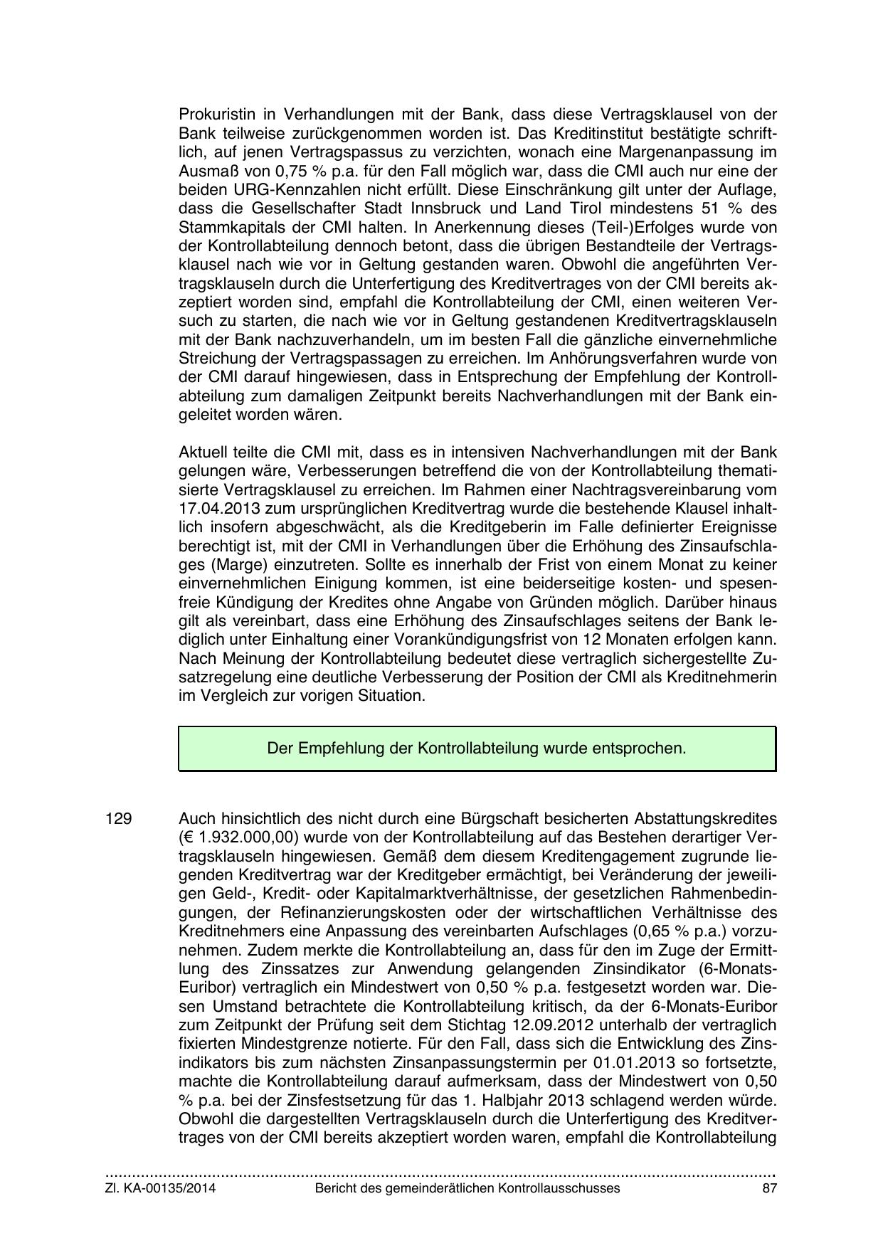 der CMI darauf hingewiesen, dass in Entsprechung der Empfehlung der Kontrollabteilung zum damaligen Zeitpunkt bereits Nachverhandlungen mit der Bank eingeleitet worden wären.