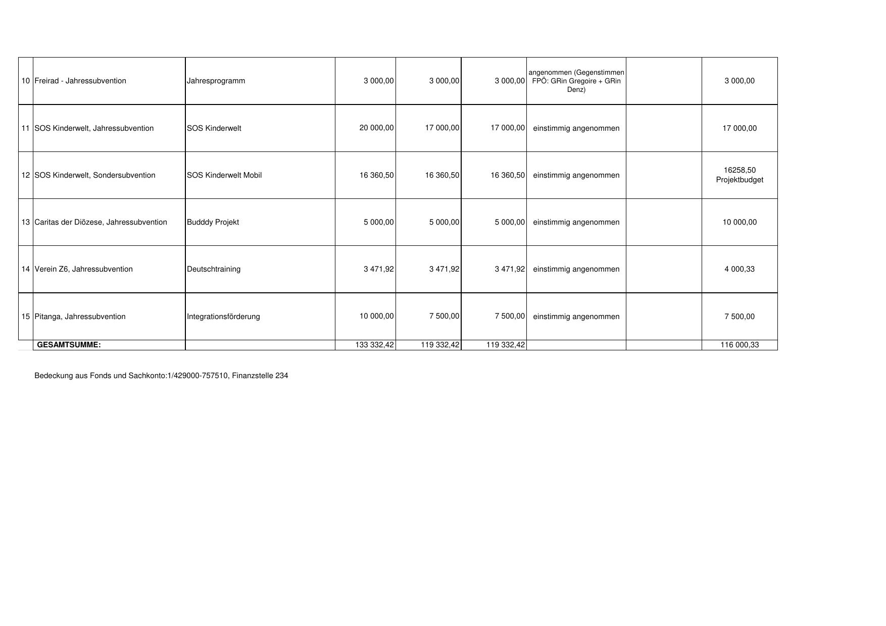 Bedeckung aus Fonds und Sachkonto:1/429000-757510, Finanzstelle 234