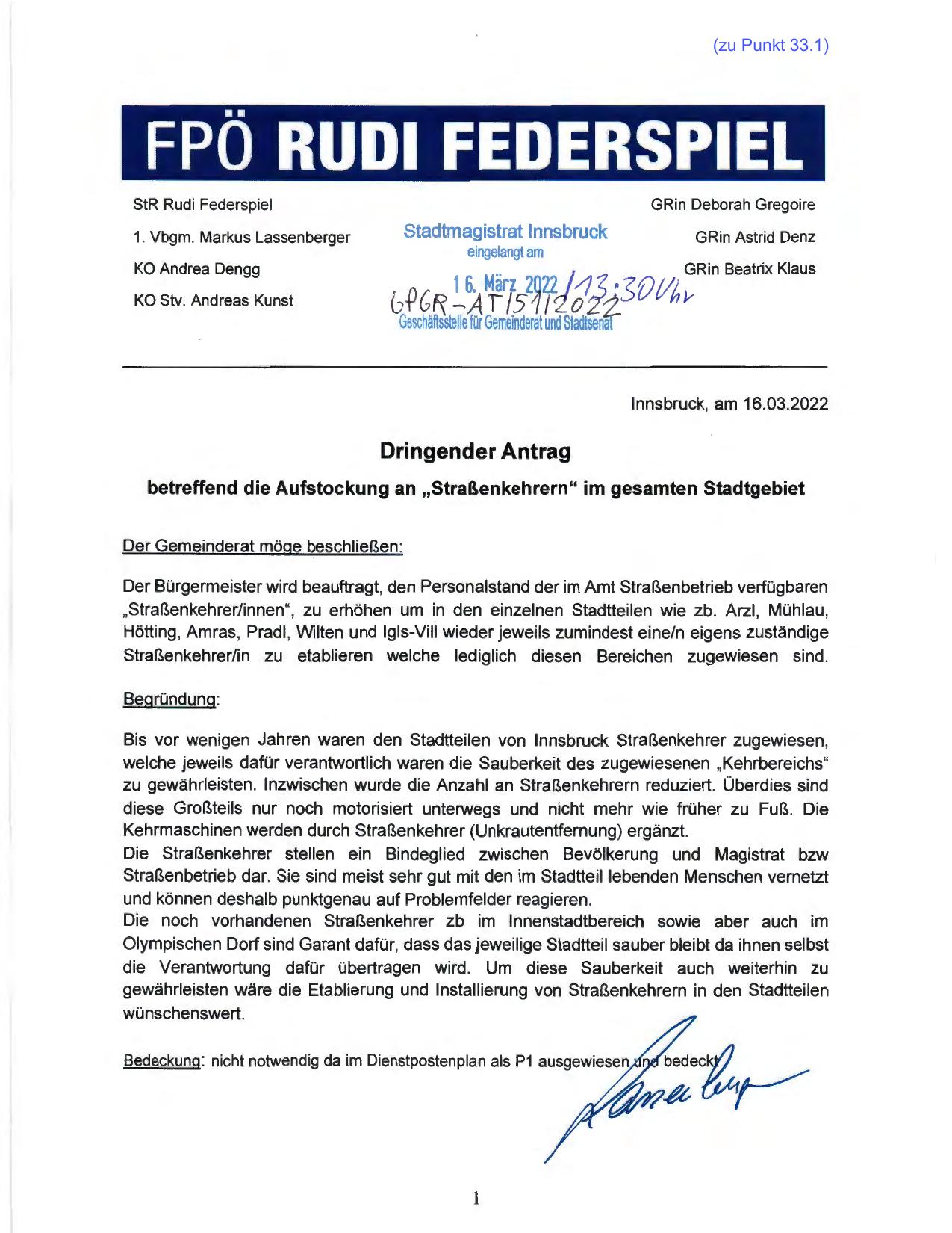 ,,Straßenkehrer/innen", zu erhöhen um in den einzelnen Stadtteilen wie zb. Arzl, Mühlau,