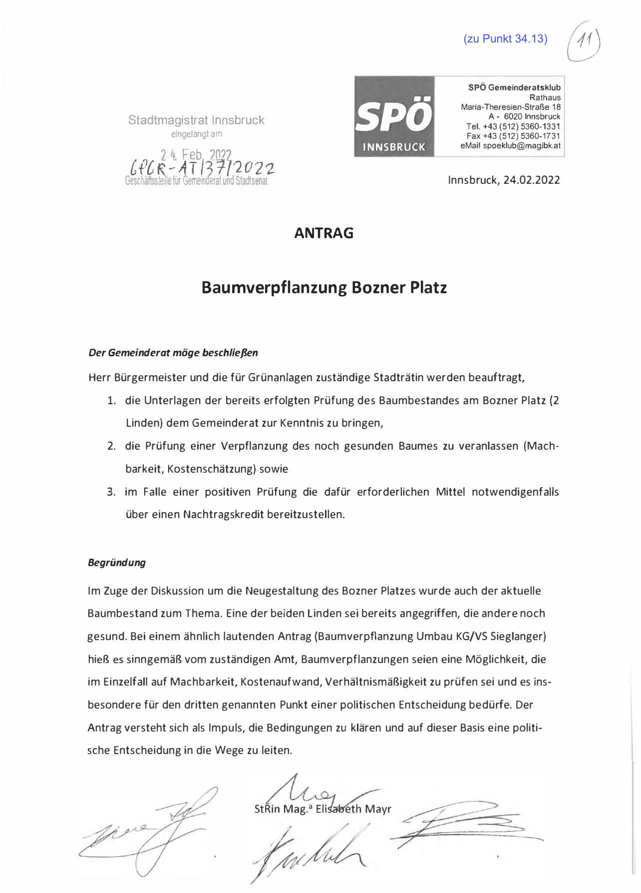 1. die Unterlagen der bereits erfolgten Prüfung des Baumbestandes am Bozner Platz (2