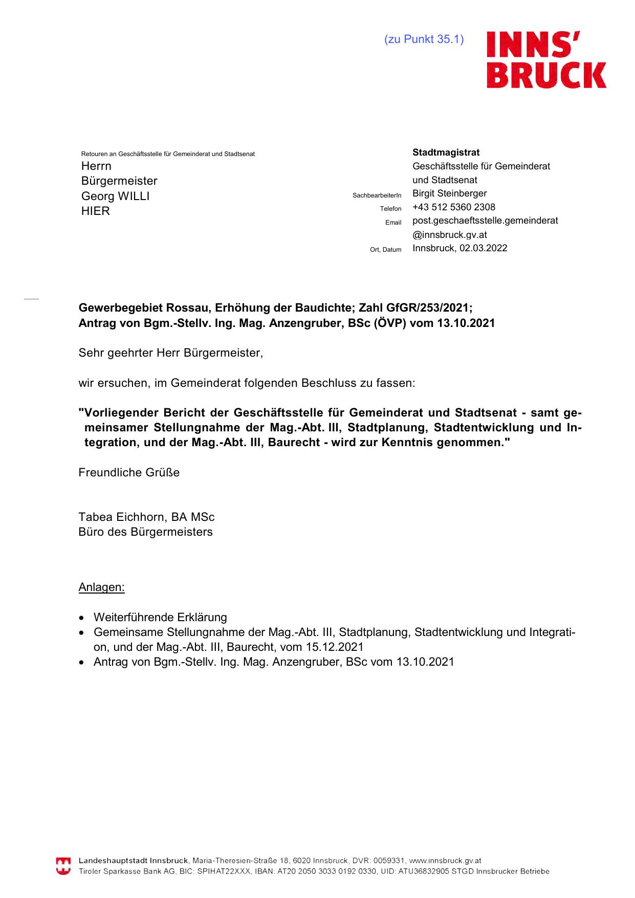Gewerbegebiet Rossau, Erhöhung der Baudichte; Zahl GfGR/253/2021;