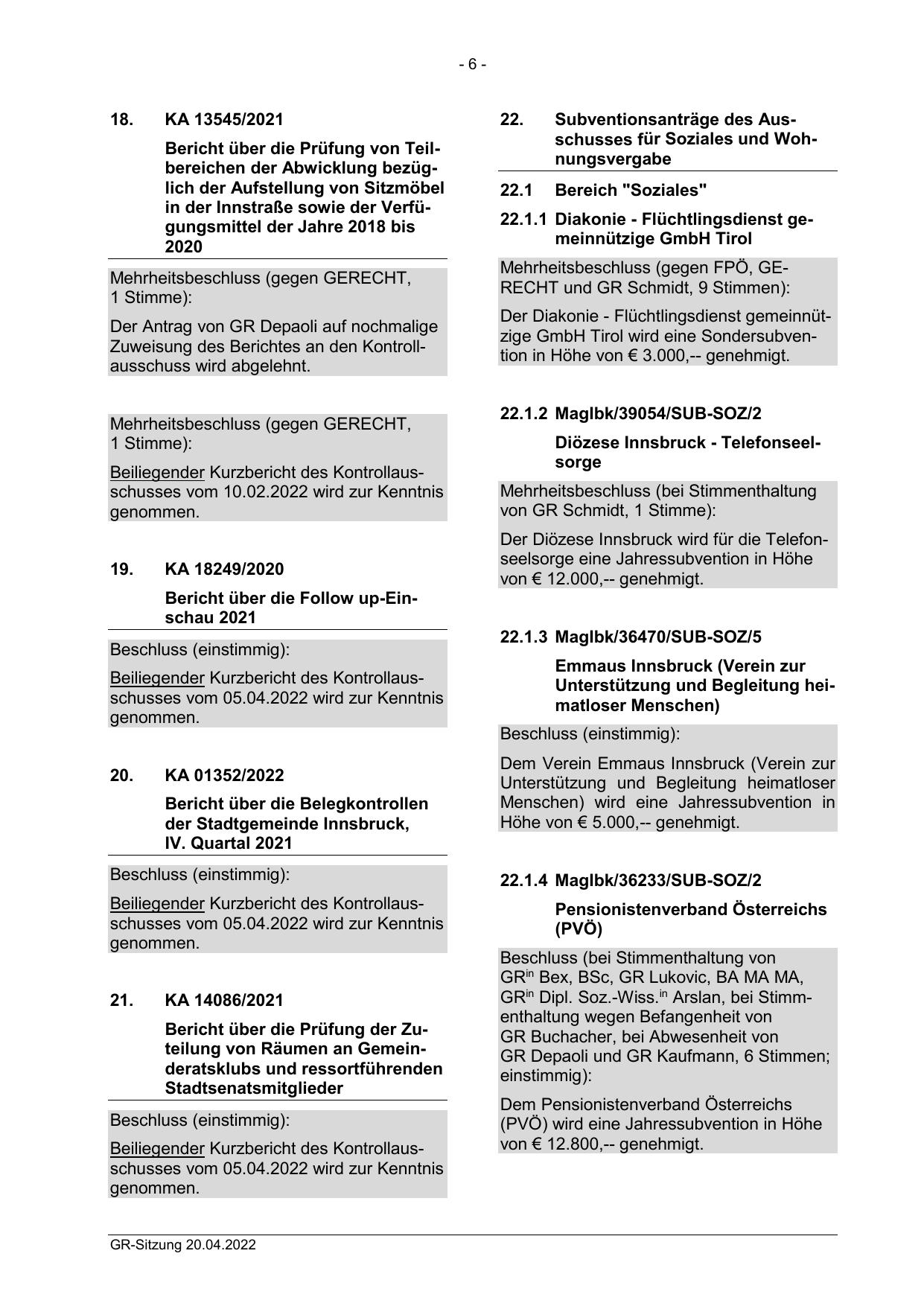 Mehrheitsbeschluss (gegen FPÖ, GERECHT und GR Schmidt, 9 Stimmen):