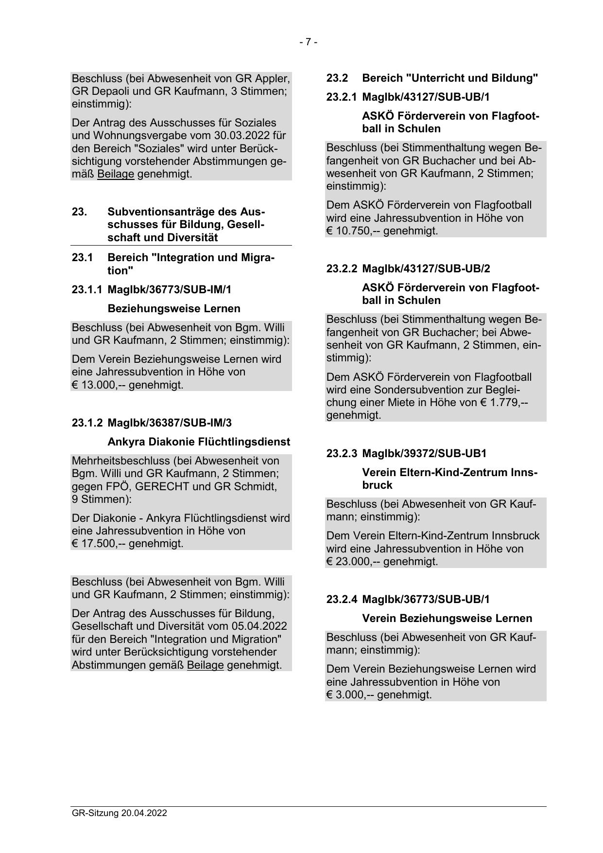 Beschluss (bei Abwesenheit von Bgm. Willi