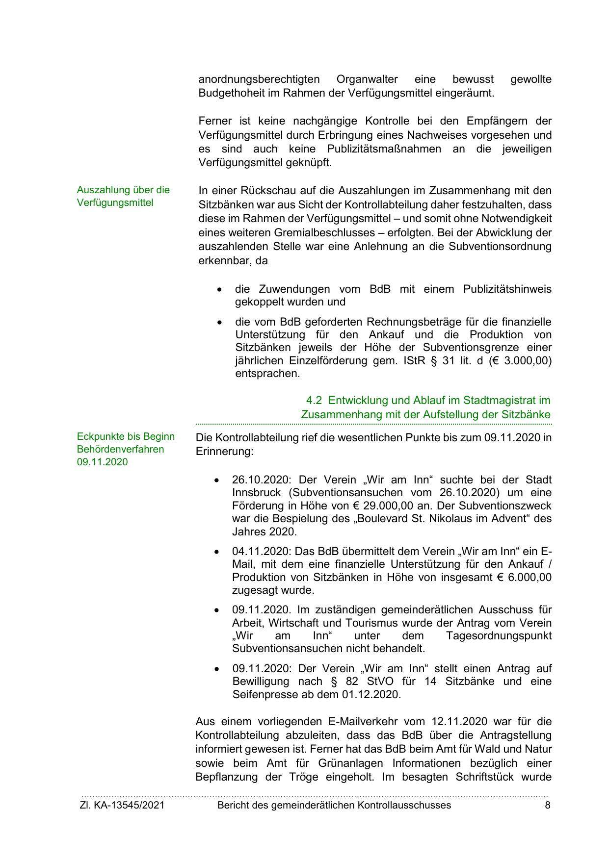 Sitzbänken war aus Sicht der Kontrollabteilung daher festzuhalten, dass