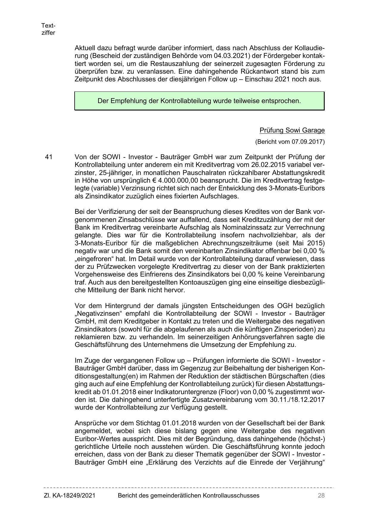Im Zuge der vergangenen Follow up – Prüfungen informierte die SOWI - Investor Bauträger GmbH darüber, dass im Gegenzug zur Beibehaltung der bisherigen Konditionsgestaltung(en) im Rahmen der Reduktion der städtischen Bürgschaften (dies