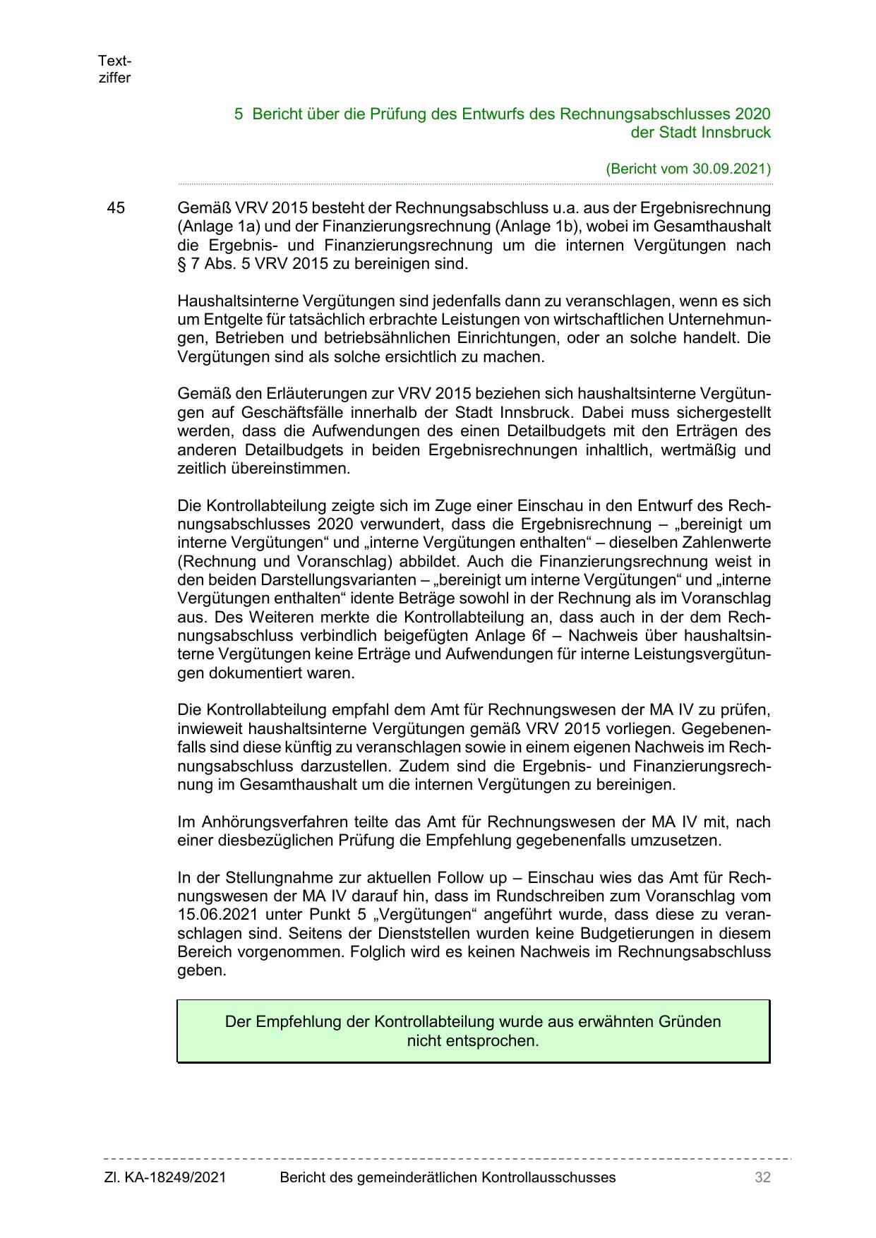 inwieweit haushaltsinterne Vergütungen gemäß VRV 2015 vorliegen. Gegebenenfalls sind diese künftig zu veranschlagen sowie in einem eigenen Nachweis im Rechnungsabschluss darzustellen. Zudem sind die Ergebnis- und Finanzierungsrechnung im Gesamthaushalt um die internen Vergütungen zu bereinigen.