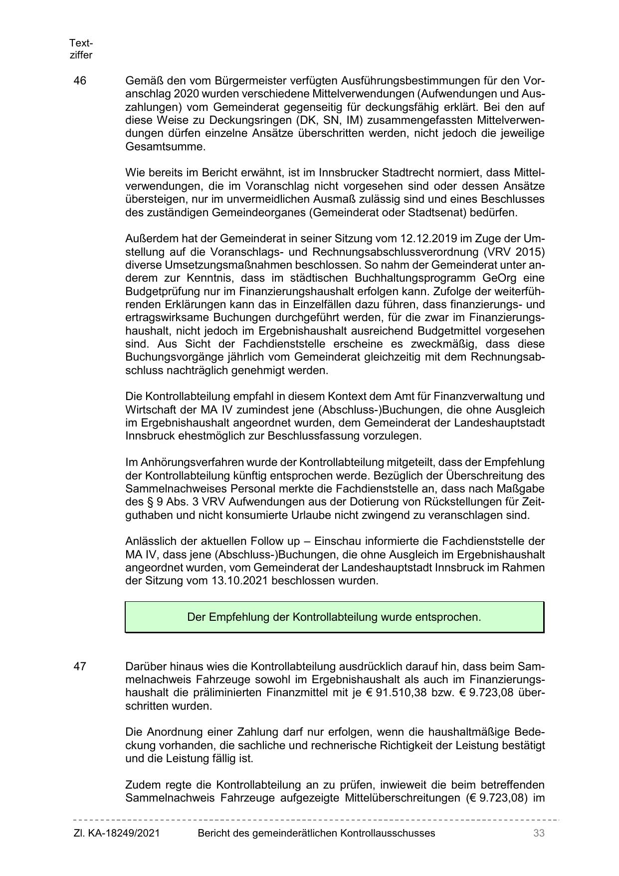 Wie bereits im Bericht erwähnt, ist im Innsbrucker Stadtrecht normiert, dass Mittelverwendungen, die im Voranschlag nicht vorgesehen sind oder dessen Ansätze
