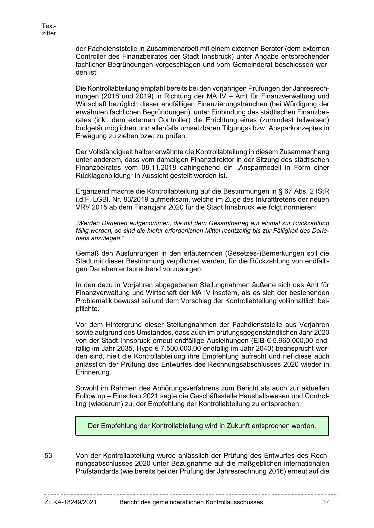 von der Stadt Innsbruck erneut endfällige Ausleihungen (EIB € 5.960.000,00 endfällig im Jahr 2035, Hypo € 7.500.000,00 endfällig im Jahr 2040) beansprucht worden sind, hielt die Kontrollabteilung ihre Empfehlung aufrecht und rief diese auch