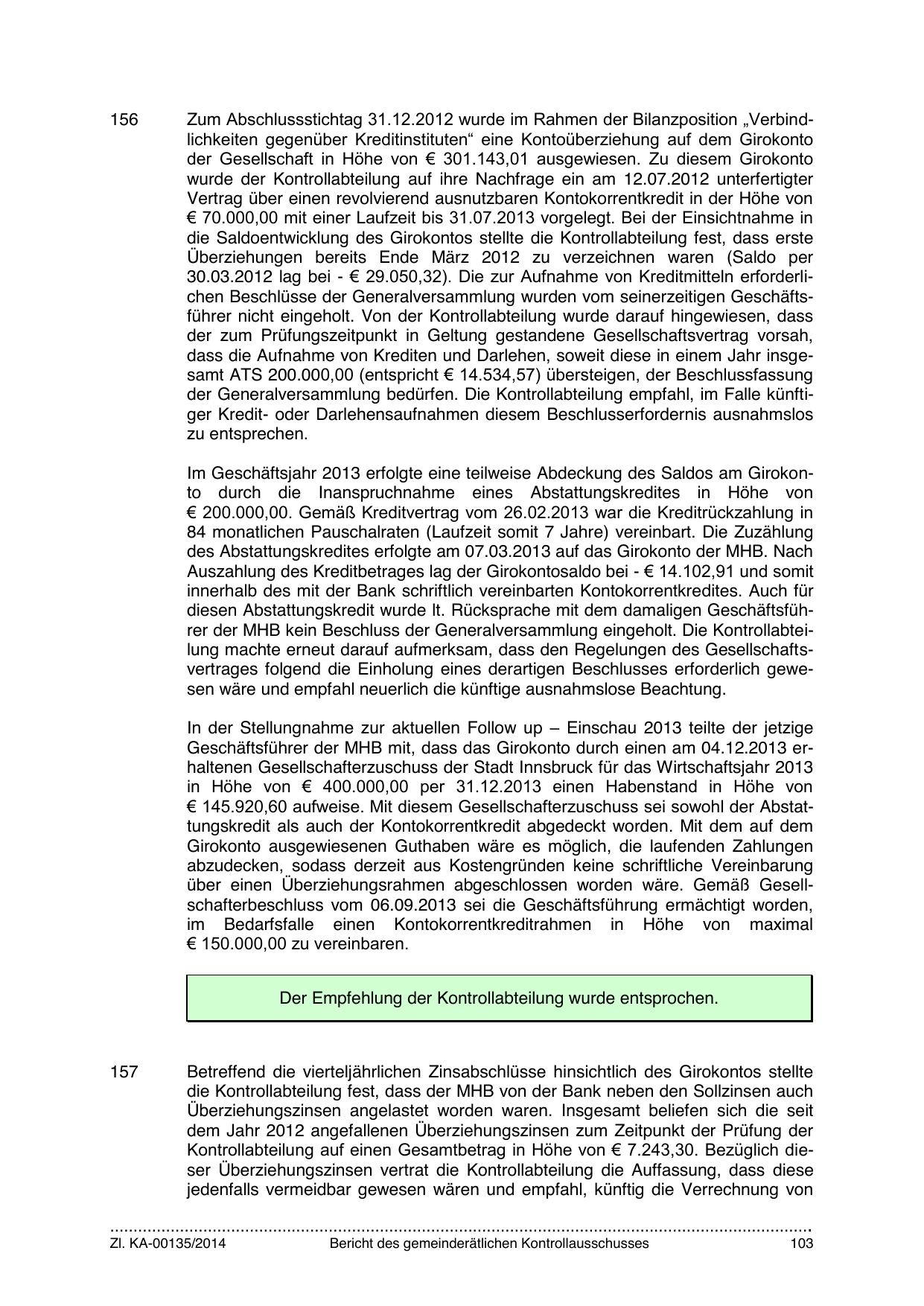 diesen Abstattungskredit wurde lt. Rücksprache mit dem damaligen Geschäftsführer der MHB kein Beschluss der Generalversammlung eingeholt. Die Kontrollabteilung machte erneut darauf aufmerksam, dass den Regelungen des Gesellschaftsvertrages folgend die Einholung eines derartigen Beschlusses erforderlich gewesen wäre und empfahl neuerlich die künftige ausnahmslose Beachtung.