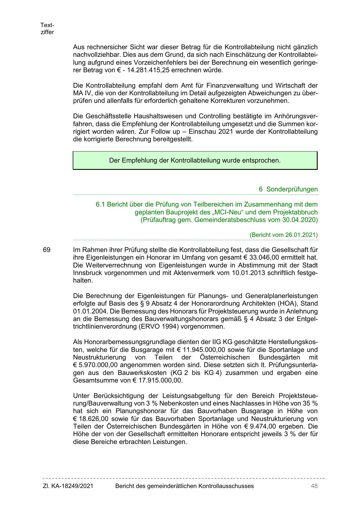 Die Geschäftsstelle Haushaltswesen und Controlling bestätigte im Anhörungsverfahren, dass die Empfehlung der Kontrollabteilung umgesetzt und die Summen korrigiert worden wären. Zur Follow up – Einschau 2021 wurde der Kontrollabteilung