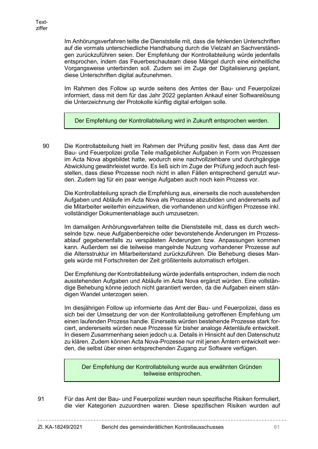 Im Rahmen des Follow up wurde seitens des Amtes der Bau- und Feuerpolizei
