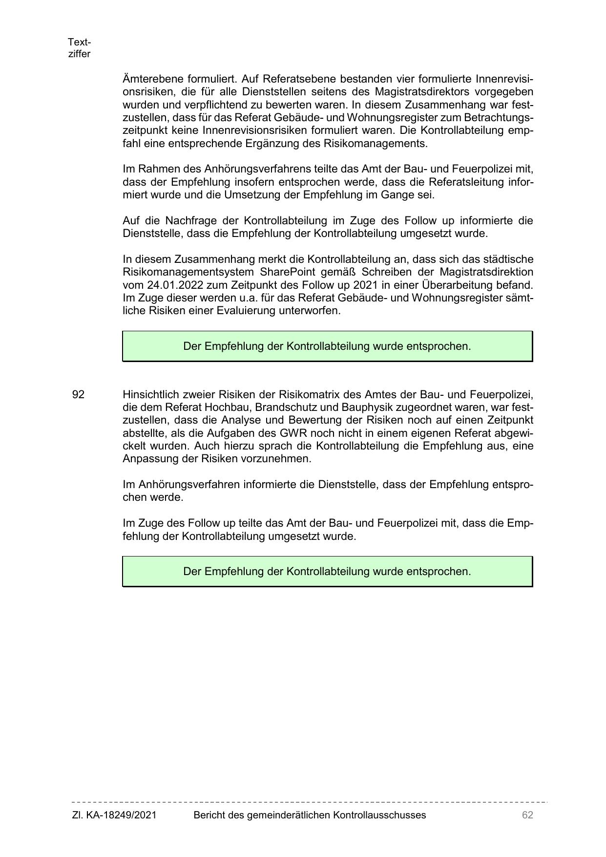 wurden und verpflichtend zu bewerten waren. In diesem Zusammenhang war festzustellen, dass für das Referat Gebäude- und Wohnungsregister zum Betrachtungszeitpunkt keine Innenrevisionsrisiken formuliert waren. Die Kontrollabteilung empfahl eine entsprechende Ergänzung des Risikomanagements.