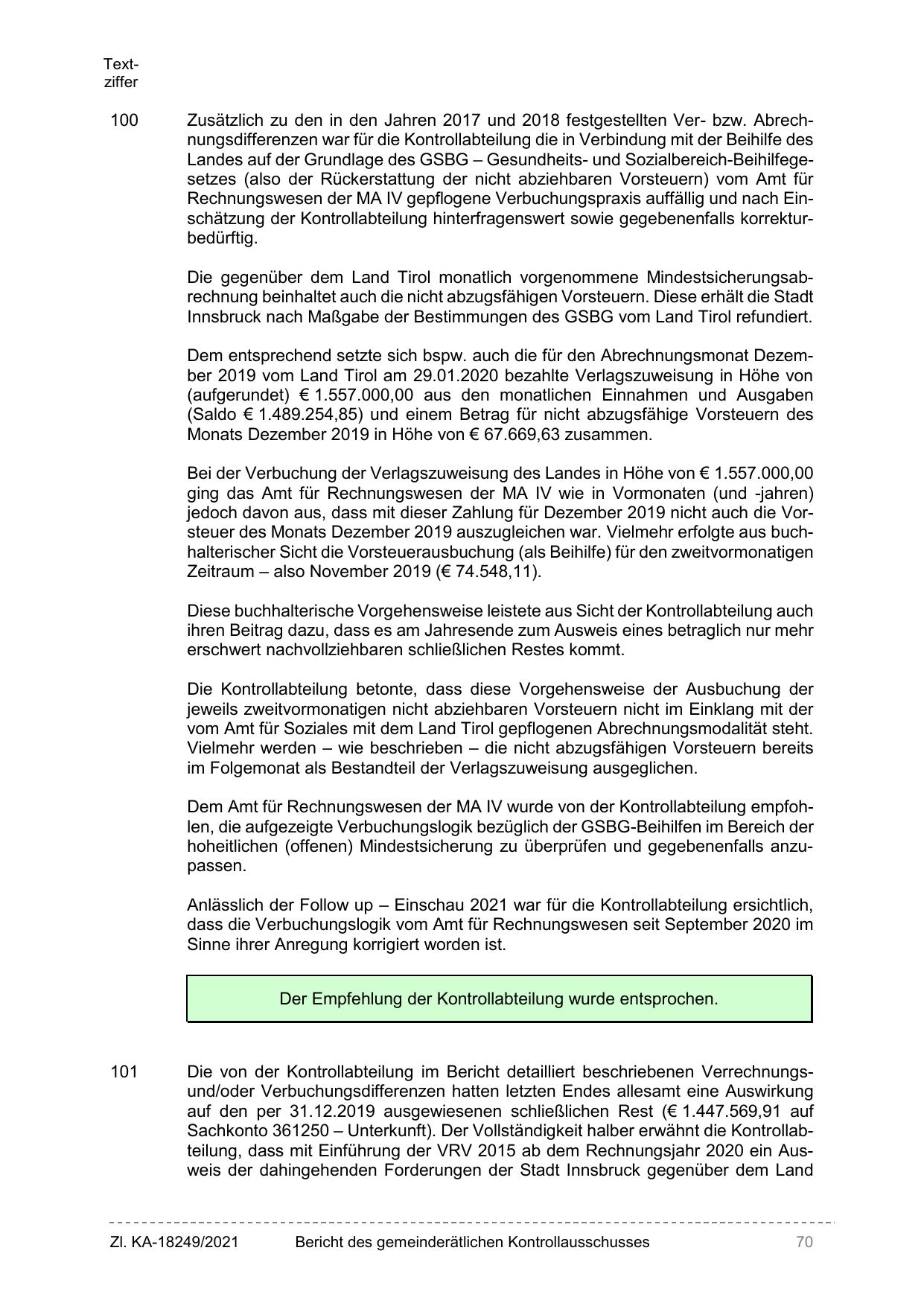 Sachkonto 361250 – Unterkunft). Der Vollständigkeit halber erwähnt die Kontrollabteilung, dass mit Einführung der VRV 2015 ab dem Rechnungsjahr 2020 ein Ausweis der dahingehenden Forderungen der Stadt Innsbruck gegenüber dem Land