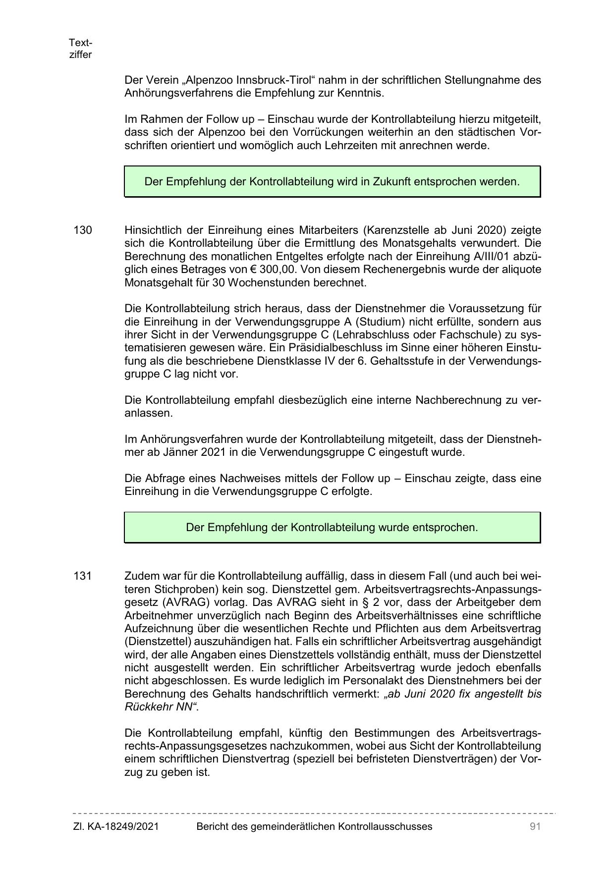 Die Kontrollabteilung empfahl, künftig den Bestimmungen des Arbeitsvertragsrechts-Anpassungsgesetzes nachzukommen, wobei aus Sicht der Kontrollabteilung