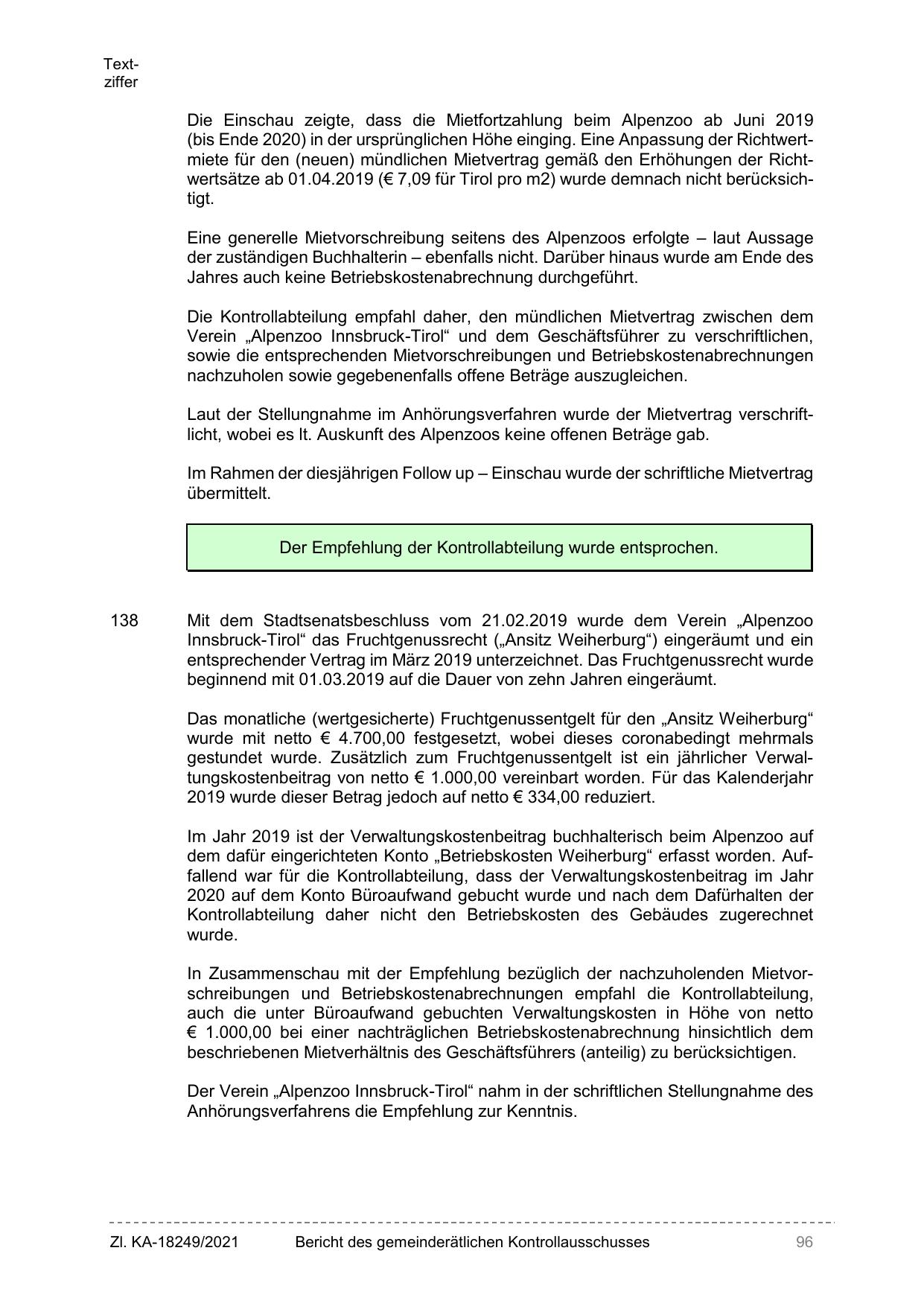 Die Einschau zeigte, dass die Mietfortzahlung beim Alpenzoo ab Juni 2019