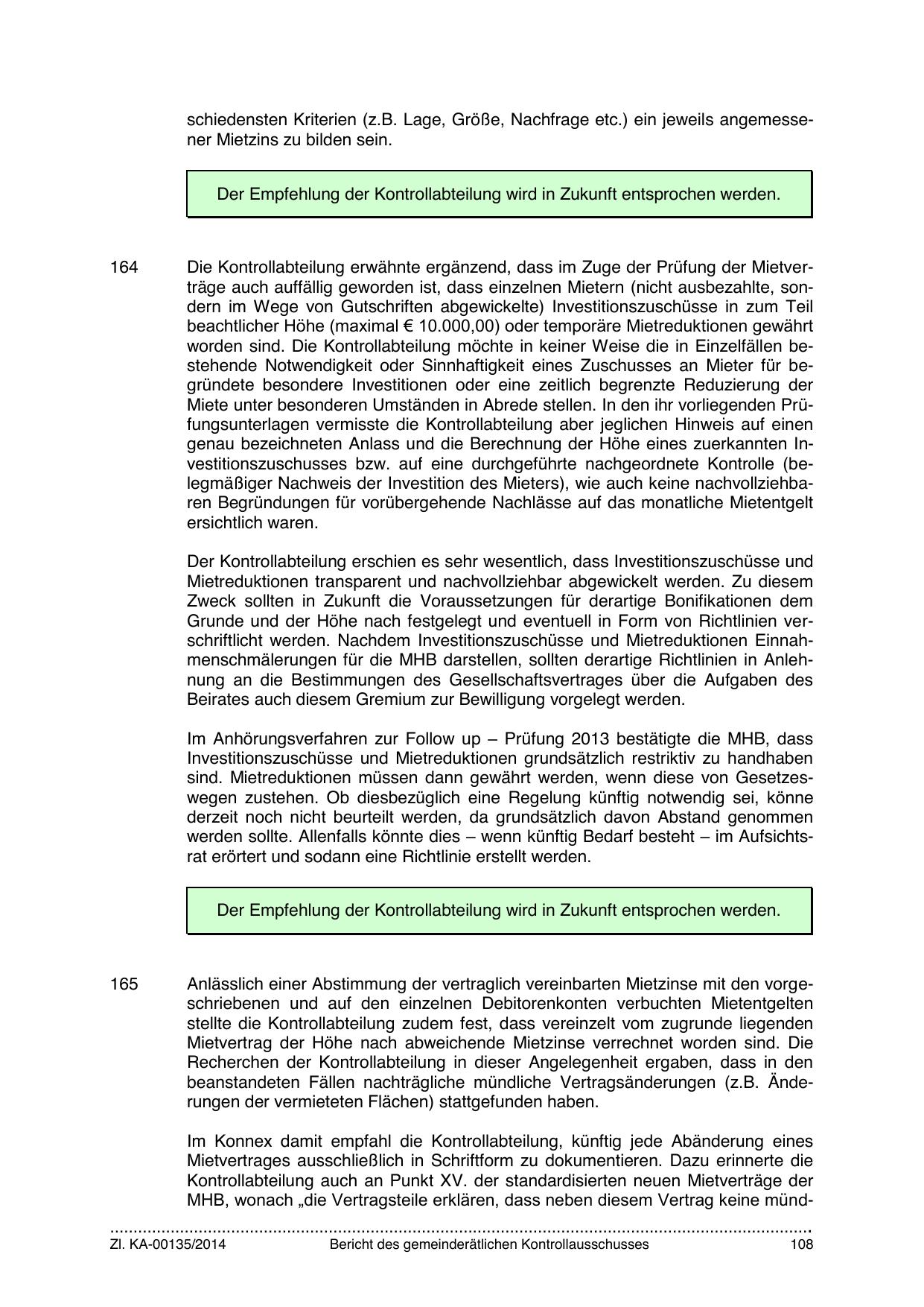 Grunde und der Höhe nach festgelegt und eventuell in Form von Richtlinien verschriftlicht werden. Nachdem Investitionszuschüsse und Mietreduktionen Einnahmenschmälerungen für die MHB darstellen, sollten derartige Richtlinien in Anlehnung an die Bestimmungen des Gesellschaftsvertrages über die Aufgaben des