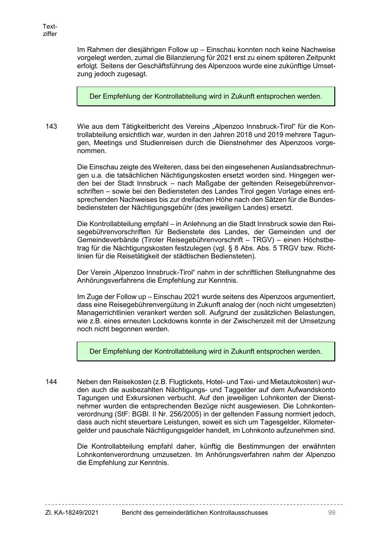 Wie aus dem Tätigkeitbericht des Vereins „Alpenzoo Innsbruck-Tirol“ für die Kontrollabteilung ersichtlich war, wurden in den Jahren 2018 und 2019 mehrere Tagungen, Meetings und Studienreisen durch die Dienstnehmer des Alpenzoos vorgenommen.