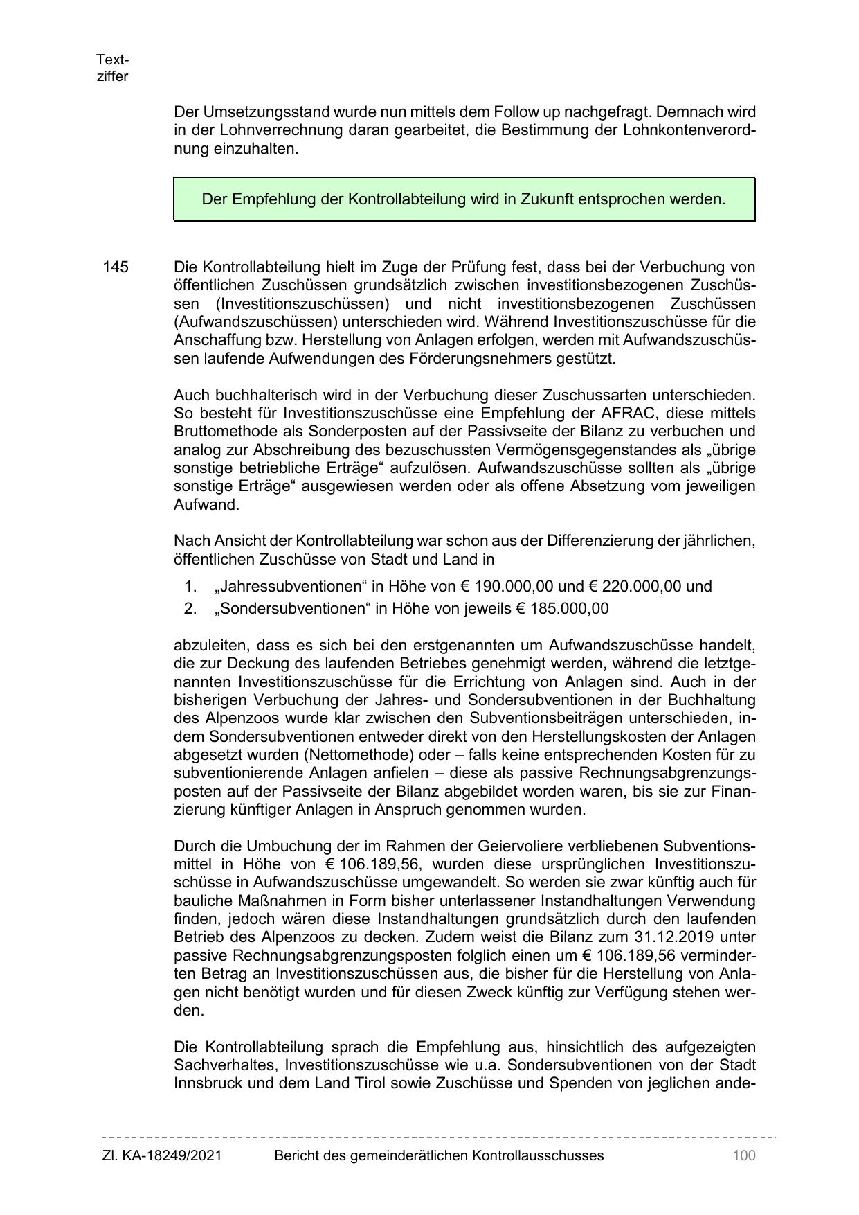 Durch die Umbuchung der im Rahmen der Geiervoliere verbliebenen Subventionsmittel in Höhe von € 106.189,56, wurden diese ursprünglichen Investitionszuschüsse in Aufwandszuschüsse umgewandelt. So werden sie zwar künftig auch für