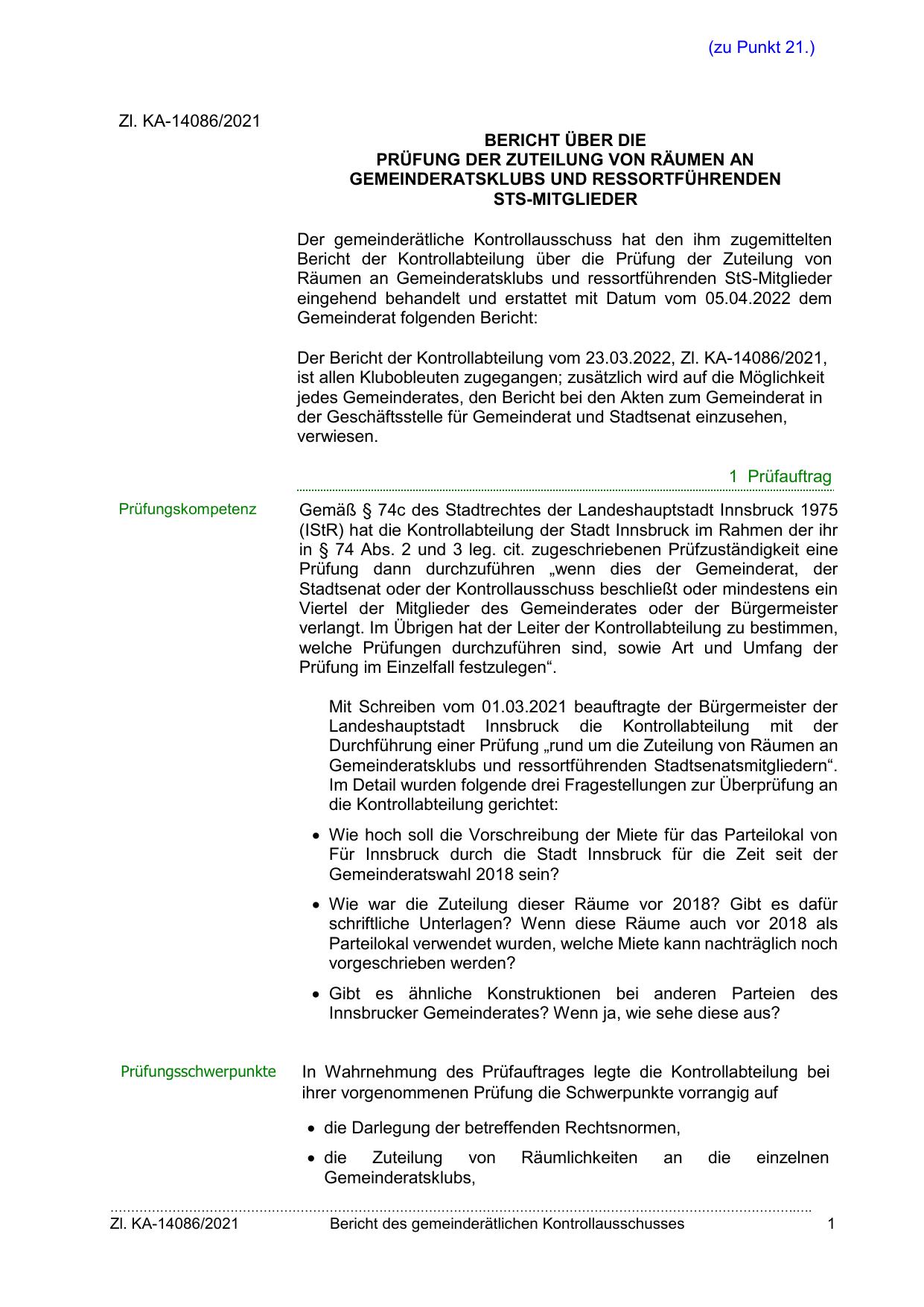 Der Bericht der Kontrollabteilung vom 23.03.2022, Zl. KA-14086/2021,