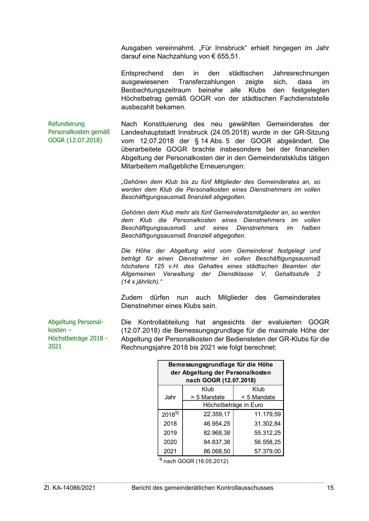 Abgeltung der Personalkosten der Bediensteten der GR-Klubs für die