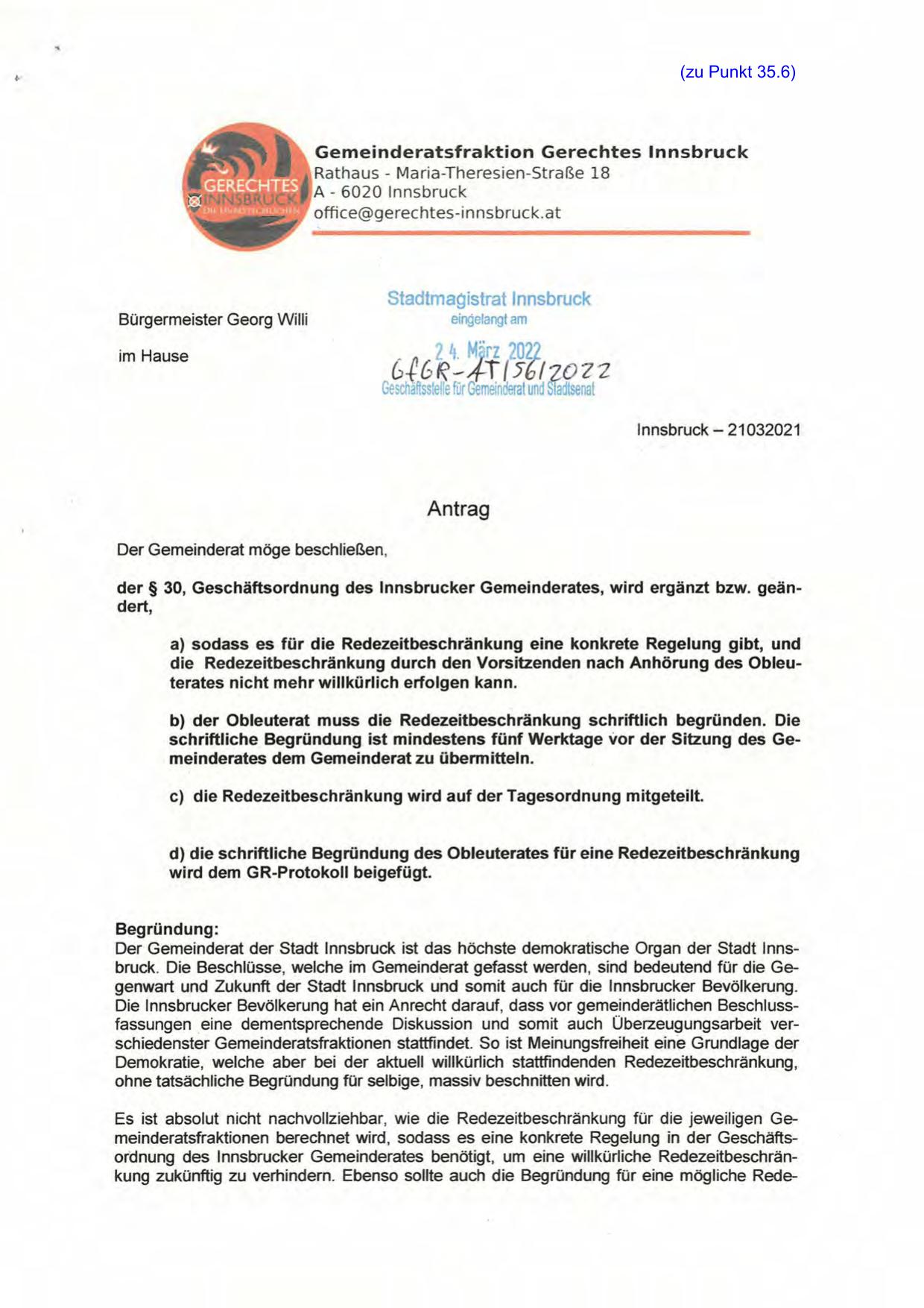 Es ist absolut nicht nachvollziehbar, wie die Redezeitbeschränkung für die jeweiligen Gemeinderatsfraktionen berechnet wird, sodass es eine konkrete Regelung in der Geschäftsordnung des lnnsbrucker Gemeinderates benötigt, um eine willkürliche Redezeitbeschränkung zukünftig zu verhindern. Ebenso sollte auch die Begründung für eine mögliche Rede-
