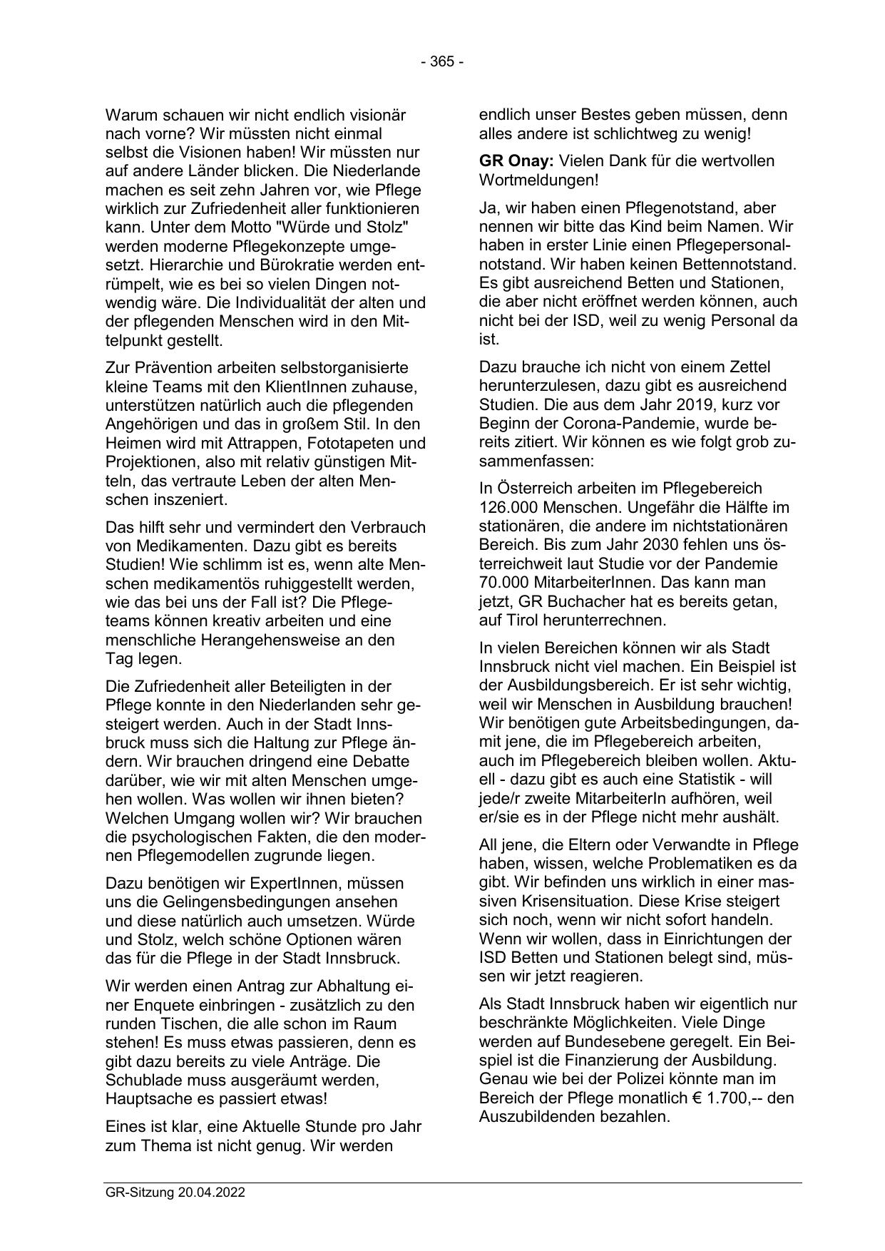 Pflege konnte in den Niederlanden sehr gesteigert werden. Auch in der Stadt Innsbruck muss sich die Haltung zur Pflege ändern. Wir brauchen dringend eine Debatte