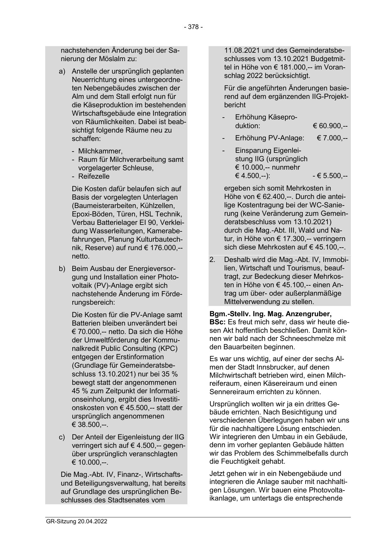 11.08.2021 und des Gemeinderatsbeschlusses vom 13.10.2021 Budgetmittel in Höhe von € 181.000,-- im Voranschlag 2022 berücksichtigt.