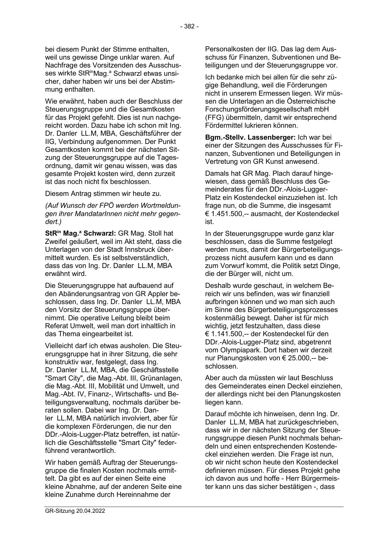 Damals hat GR Mag. Plach darauf hingewiesen, dass gemäß Beschluss des Gemeinderates für den DDr.-Alois-LuggerPlatz ein Kostendeckel einzuziehen ist. Ich