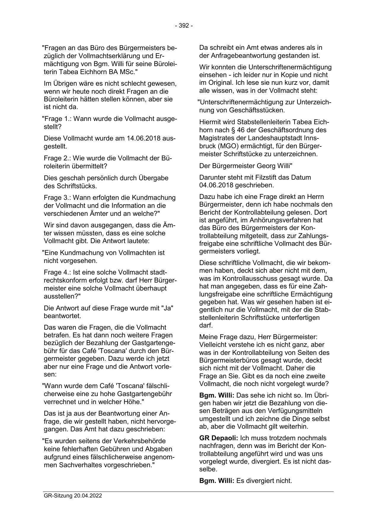 bezüglich der Bezahlung der Gastgartengebühr für das Café "Toscana" durch den Bürgermeister gegeben. Dazu werde ich jetzt