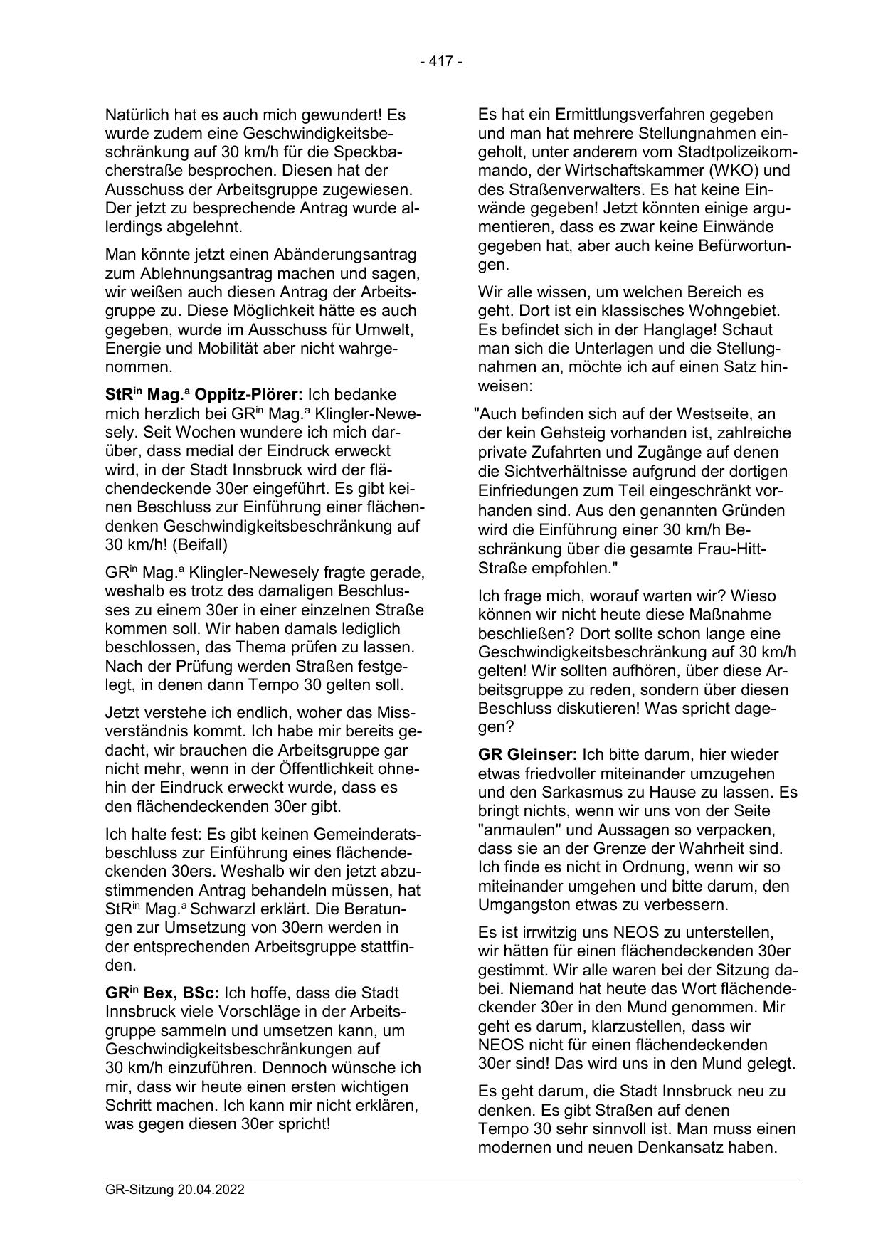 wurde zudem eine Geschwindigkeitsbeschränkung auf 30 km/h für die Speckbacherstraße besprochen. Diesen hat der