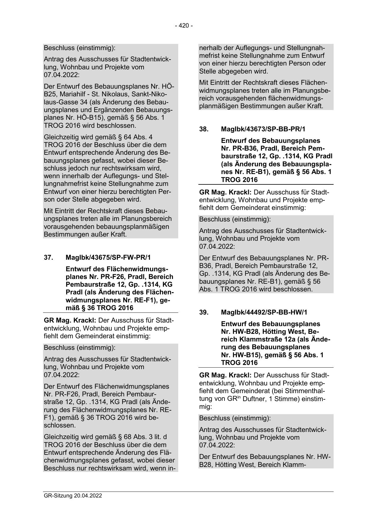 GR Mag. Krackl: Der Ausschuss für Stadtentwicklung, Wohnbau und Projekte empfiehlt dem Gemeinderat einstimmig: