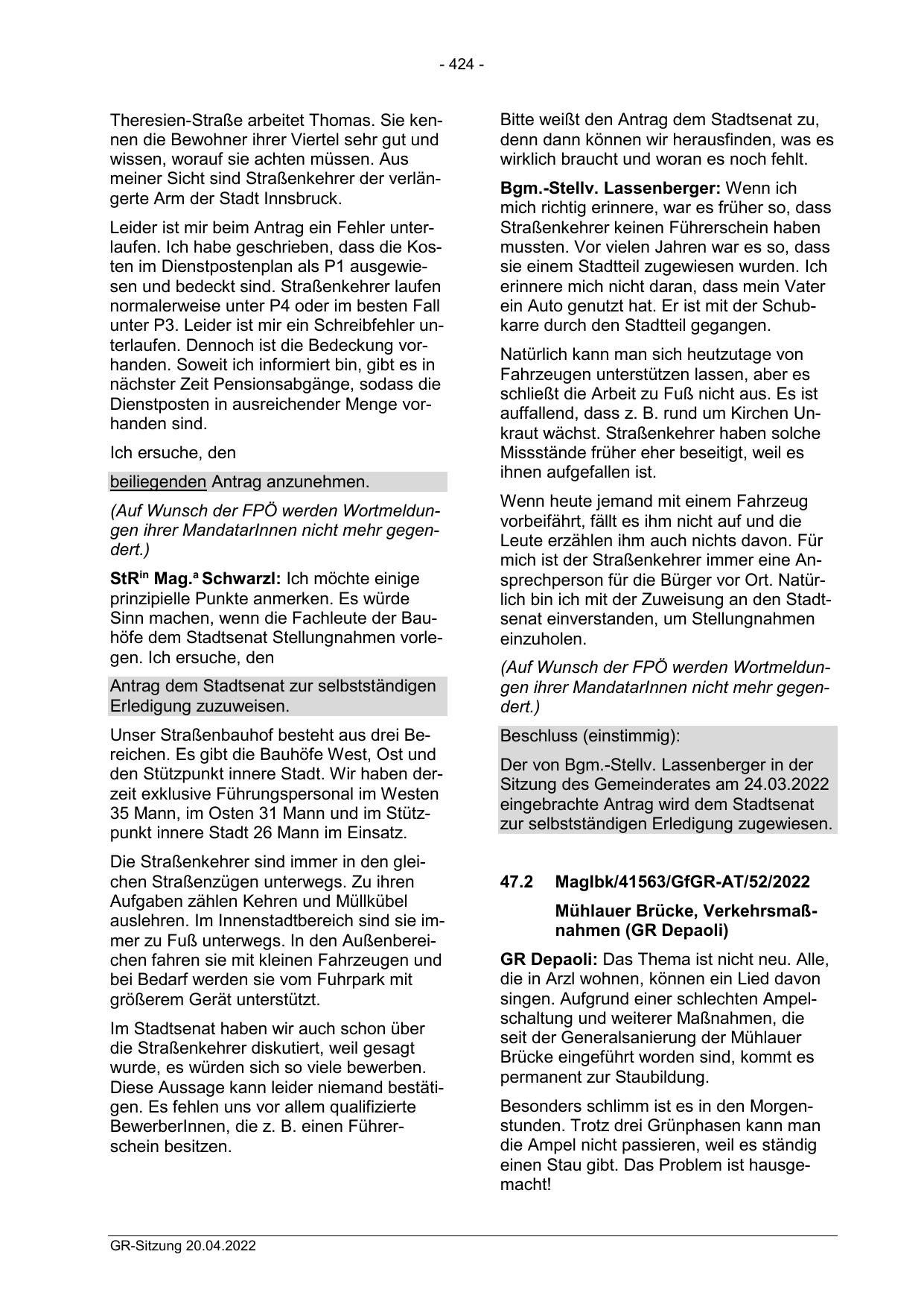 mich ist der Straßenkehrer immer eine Ansprechperson für die Bürger vor Ort. Natürlich bin ich mit der Zuweisung an den Stadtsenat einverstanden, um Stellungnahmen