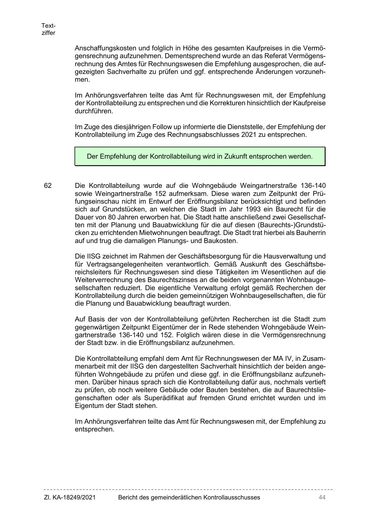 sowie Weingartnerstraße 152 aufmerksam. Diese waren zum Zeitpunkt der Prüfungseinschau nicht im Entwurf der Eröffnungsbilanz berücksichtigt und befinden