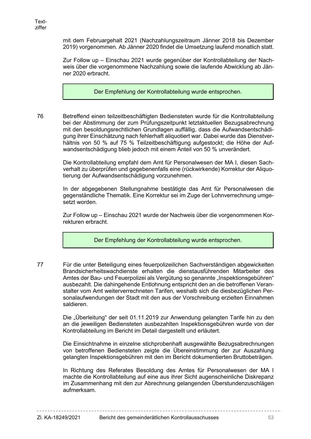 Die Kontrollabteilung empfahl dem Amt für Personalwesen der MA I, diesen Sachverhalt zu überprüfen und gegebenenfalls eine (rückwirkende) Korrektur der Aliquotierung der Aufwandsentschädigung vorzunehmen.
