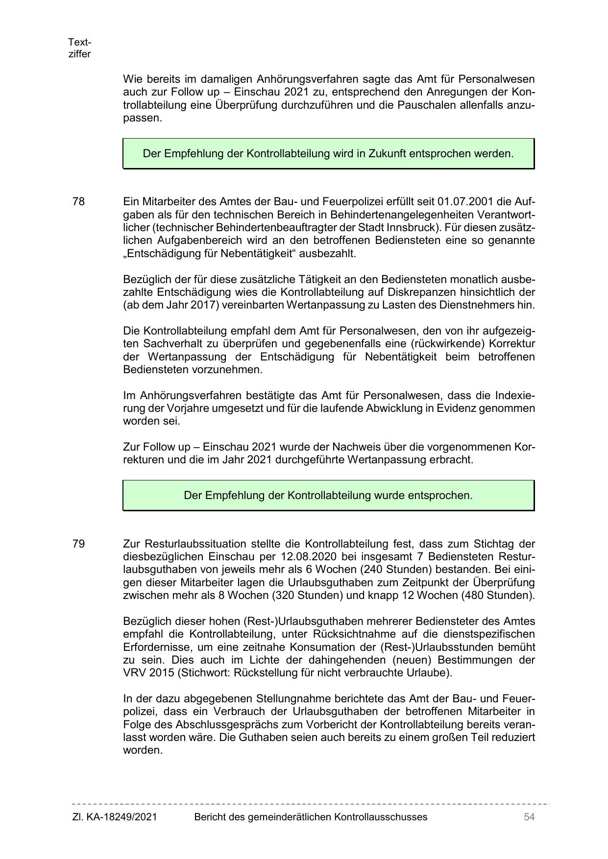 In der dazu abgegebenen Stellungnahme berichtete das Amt der Bau- und Feuerpolizei, dass ein Verbrauch der Urlaubsguthaben der betroffenen Mitarbeiter in