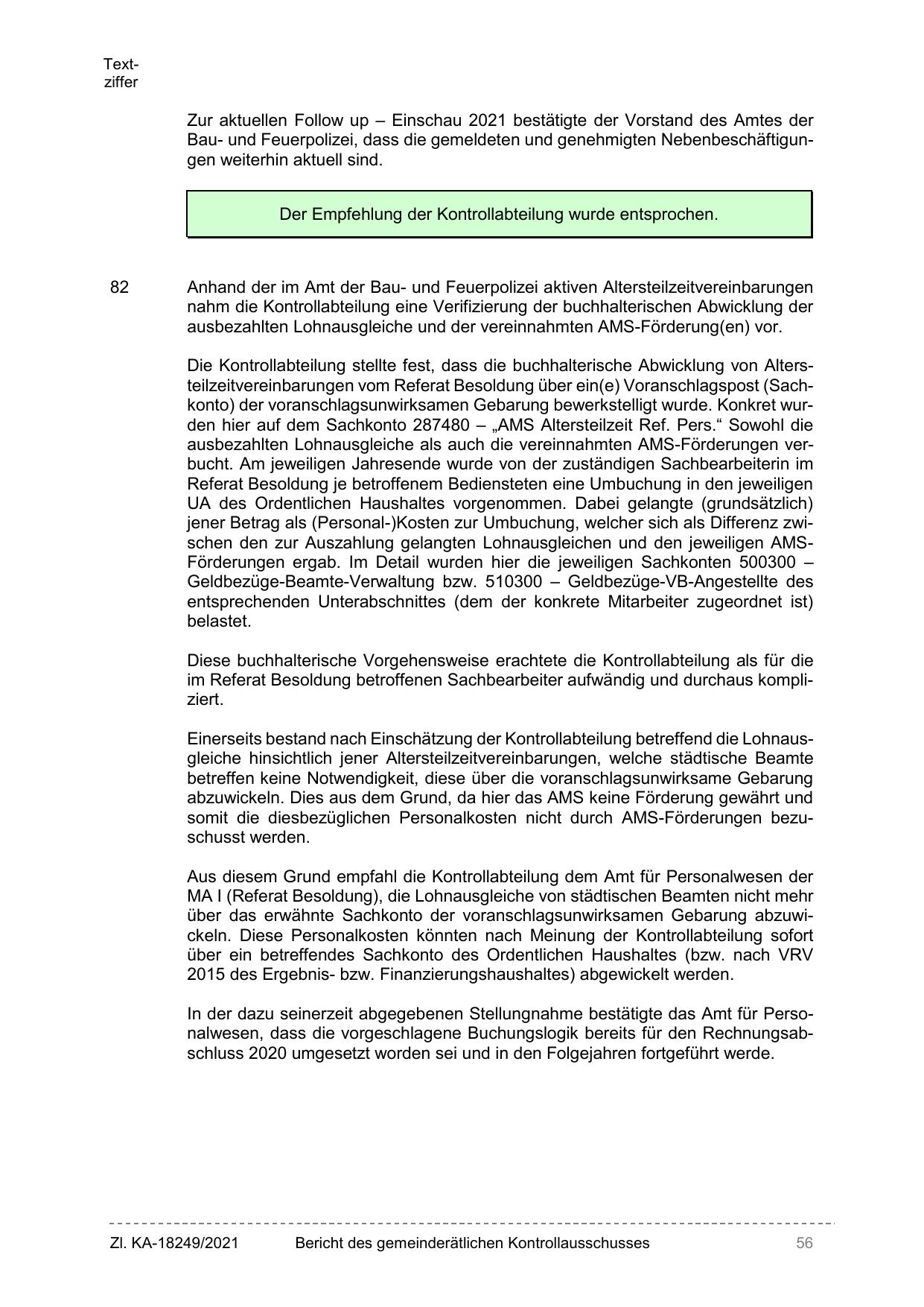 In der dazu seinerzeit abgegebenen Stellungnahme bestätigte das Amt für Personalwesen, dass die vorgeschlagene Buchungslogik bereits für den Rechnungsabschluss 2020 umgesetzt worden sei und in den Folgejahren fortgeführt werde.