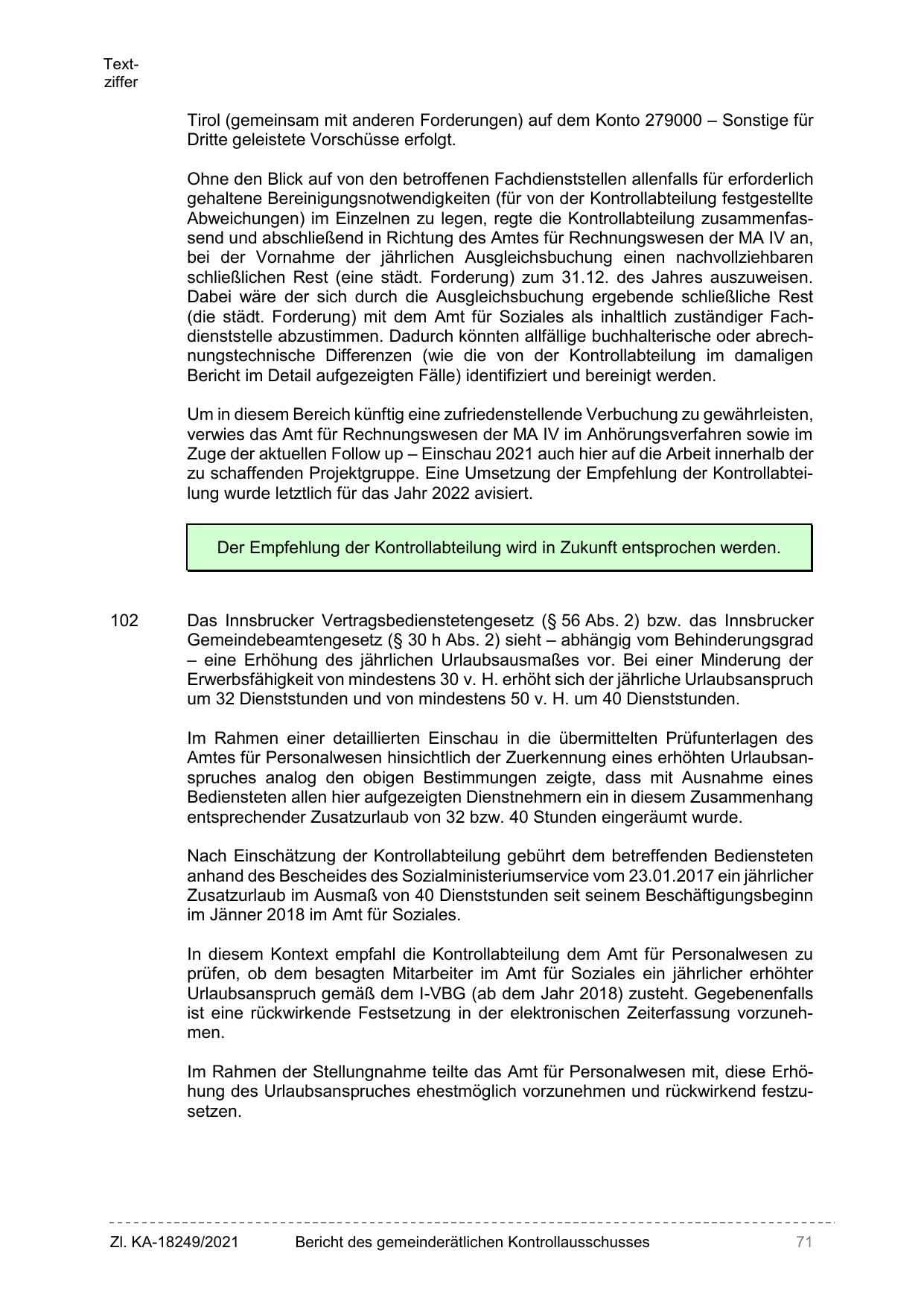 zu schaffenden Projektgruppe. Eine Umsetzung der Empfehlung der Kontrollabteilung wurde letztlich für das Jahr 2022 avisiert.