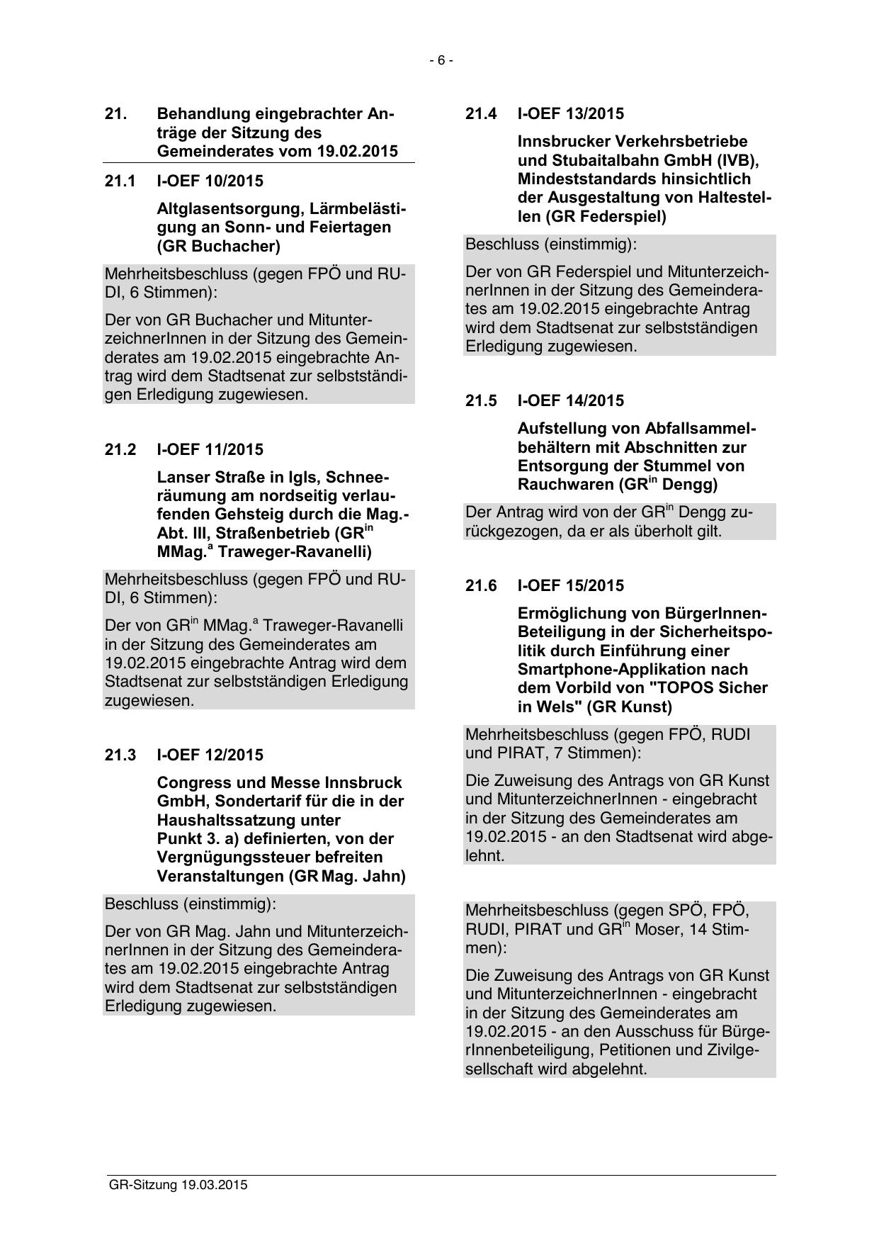Mehrheitsbeschluss (gegen FPÖ und RUDI, 6 Stimmen):