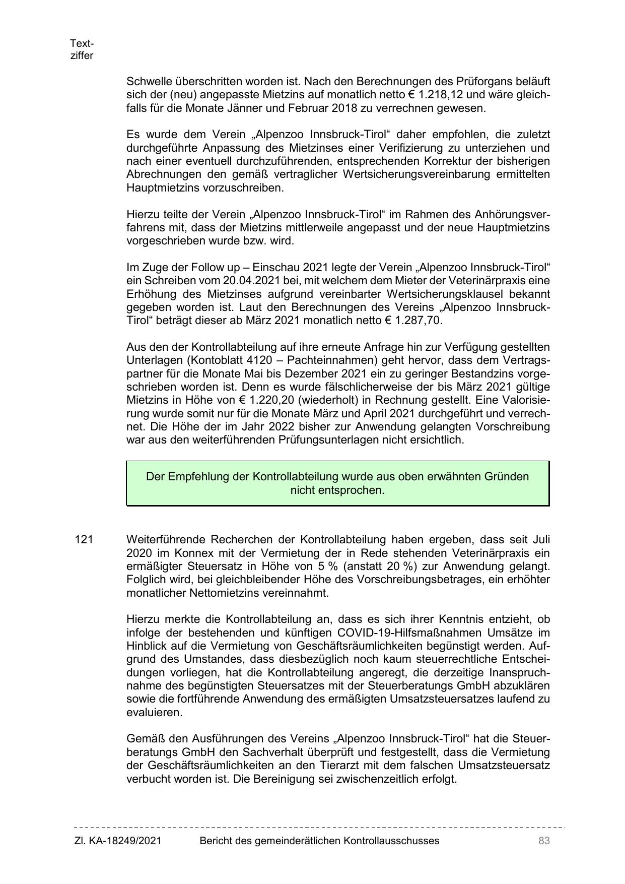 Hierzu teilte der Verein „Alpenzoo Innsbruck-Tirol“ im Rahmen des Anhörungsverfahrens mit, dass der Mietzins mittlerweile angepasst und der neue Hauptmietzins