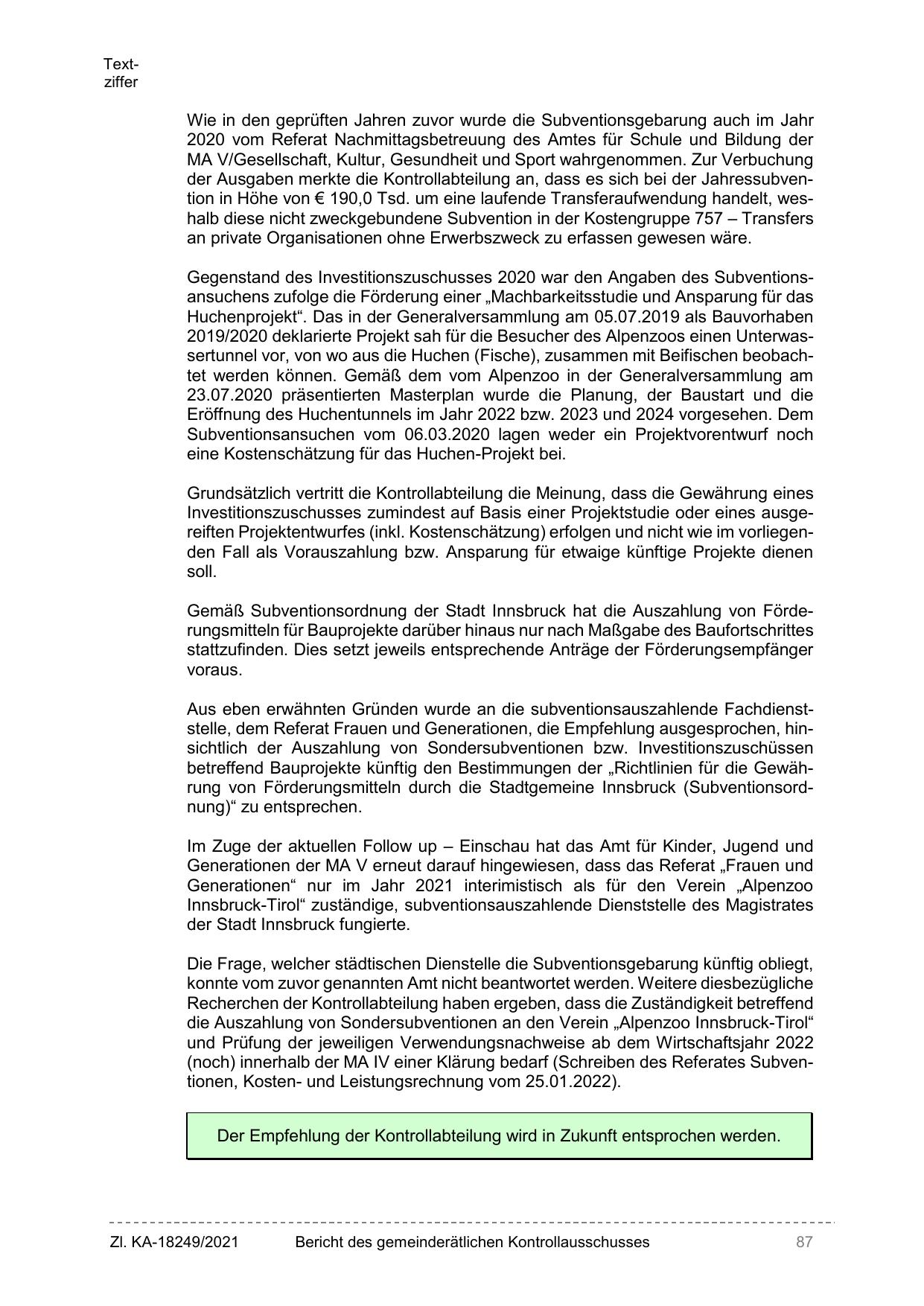 Aus eben erwähnten Gründen wurde an die subventionsauszahlende Fachdienststelle, dem Referat Frauen und Generationen, die Empfehlung ausgesprochen, hinsichtlich der Auszahlung von Sondersubventionen bzw. Investitionszuschüssen