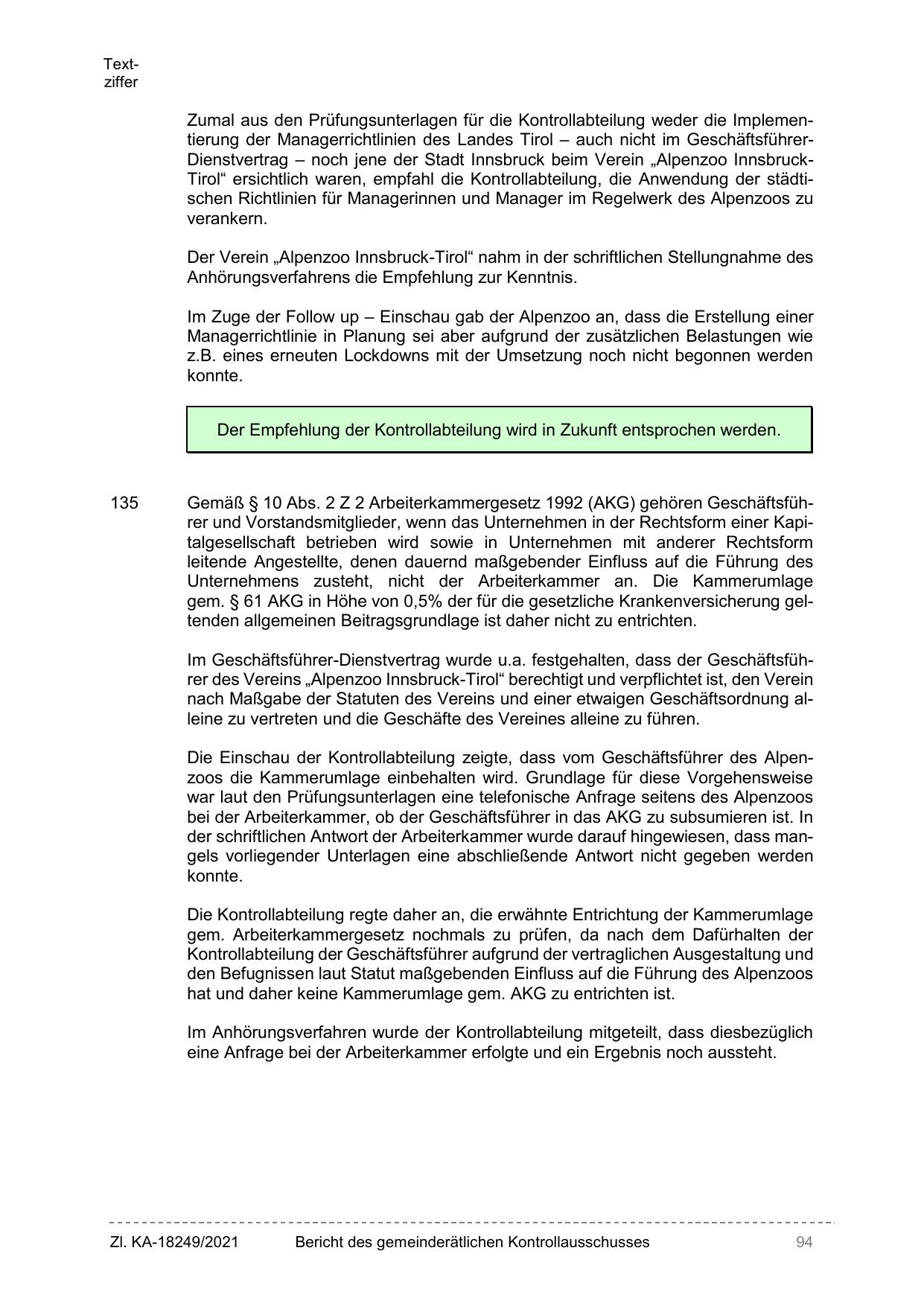 Zumal aus den Prüfungsunterlagen für die Kontrollabteilung weder die Implementierung der Managerrichtlinien des Landes Tirol – auch nicht im GeschäftsführerDienstvertrag – noch jene der Stadt Innsbruck beim Verein „Alpenzoo InnsbruckTirol“ ersichtlich waren, empfahl die Kontrollabteilung, die Anwendung der städtischen Richtlinien für Managerinnen und Manager im Regelwerk des Alpenzoos zu