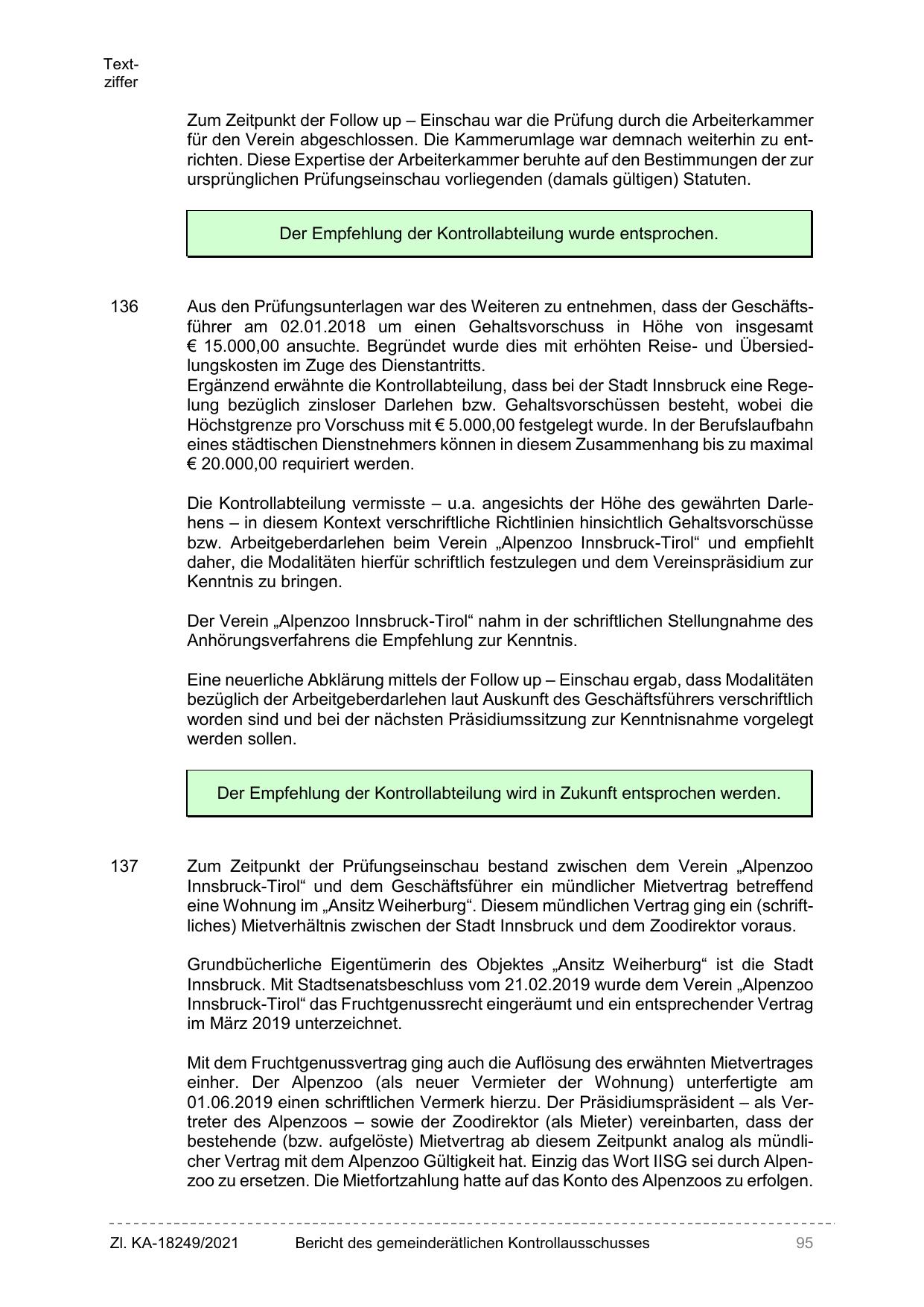 Ergänzend erwähnte die Kontrollabteilung, dass bei der Stadt Innsbruck eine Regelung bezüglich zinsloser Darlehen bzw. Gehaltsvorschüssen besteht, wobei die